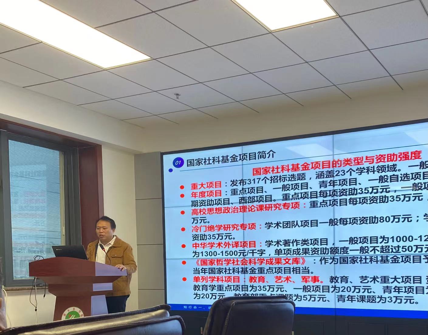 会议伊始,田梅副院长介绍了此次选题论证会的举办目的和意义,并汇报了我院近年来取得的高级别科研立项成果(5项国家社科基金、4项国家自科基金、9项教育部课题等)。胡德华教授以人文社科研究的前沿视角,从国家政策出发,着眼落实到具体问题,向与会教师分享了成功申报国家社科基金项目的的经验,从选题思路、选题要求、选题方法、选题中的主要问题等多个方面进行了详细讲解;并围绕项目的论证从研究方法、研究思路、研究内容等方面进行了介绍和指导。