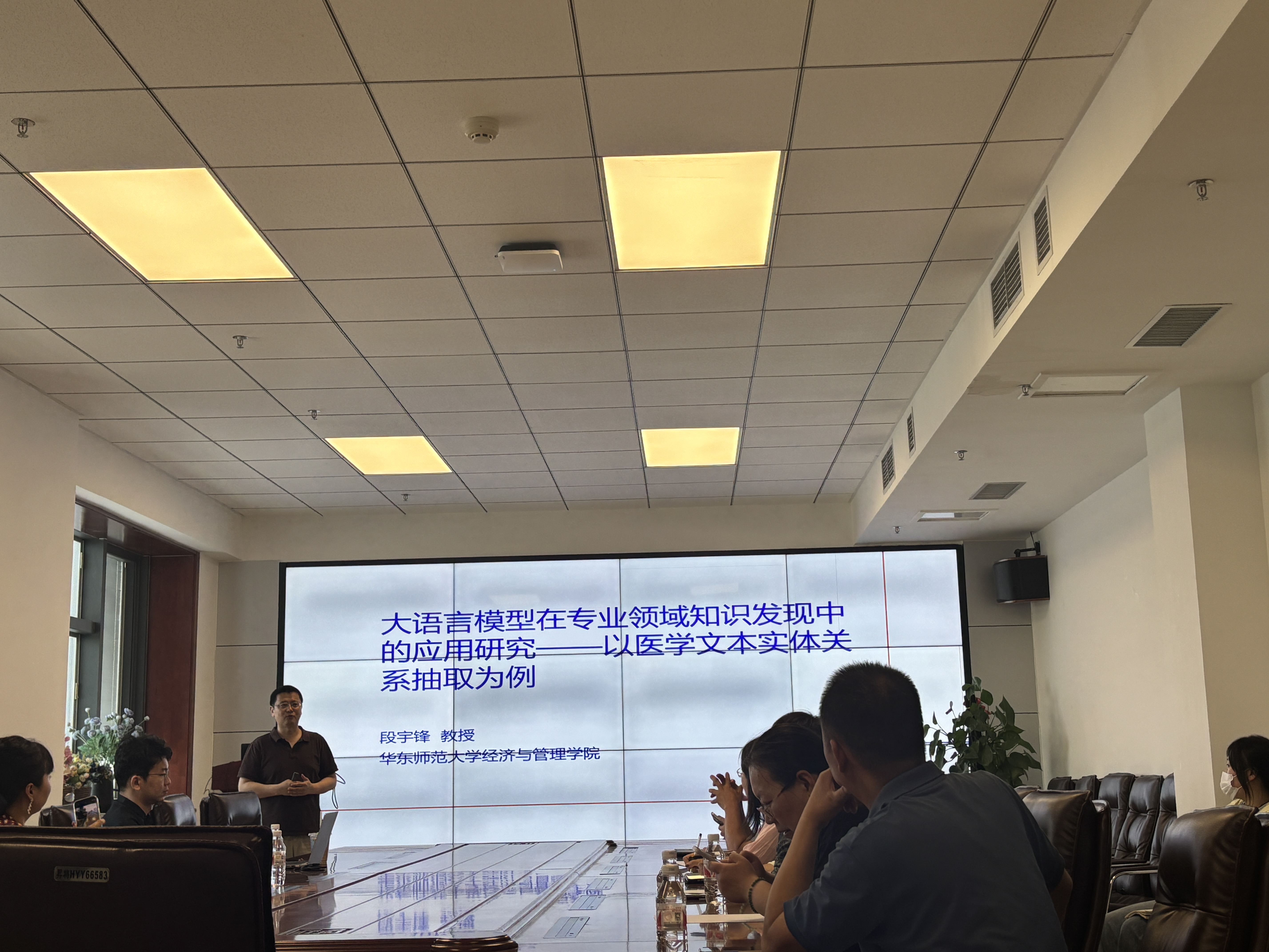 5月19日,华东师范大学经济与管理学院段宇锋教授来我院,作主题为“大语言模型(LLM)在专业领域知识发现中的应用研究——以医学文本实体关系抽取为例”的学术讲座。本次讲座由副院长田梅主持,教师代表及研究生参加。