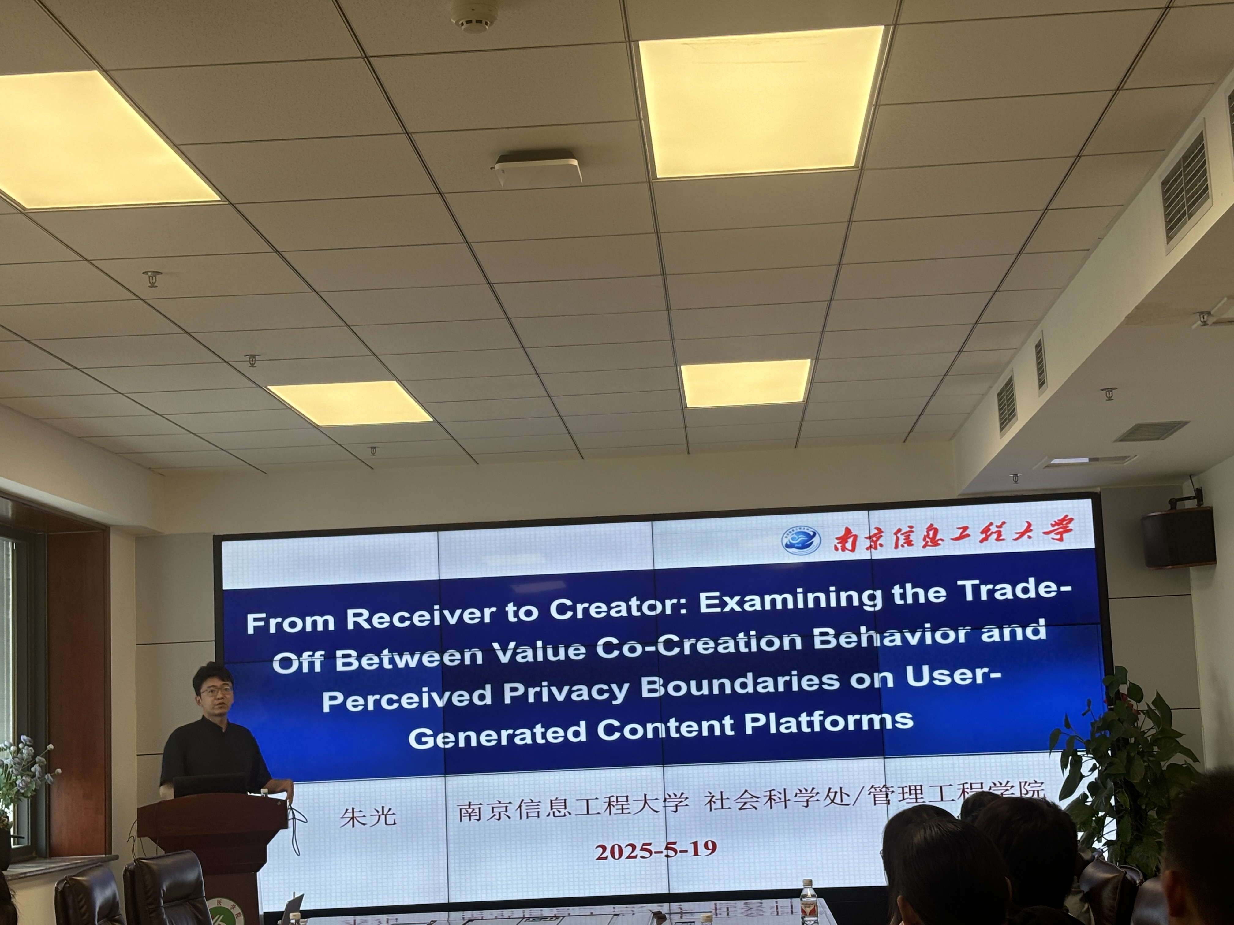 5月19日,南京信息工程大学社会科学处副处长朱光教授来我院,作主题为“From Receiver to Creator: Examining the Trade-Off Between Value Co-Creation Behavior and Perceived Privacy Boundaries on User-Generated Content Platforms”的学术讲座。本次讲座由副院长田梅主持,教师代表及研究生参加。