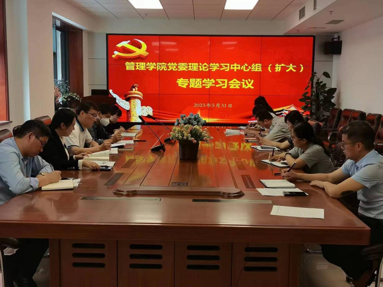 2023年5月31日上午,管理学院党委在图书信息楼南楼5楼508会议室召开理论学习中心组(扩大)专题学习会。学院全体处级干部、各党支部书记等参加会议。会议由学院党委副书记郭兆红主持。