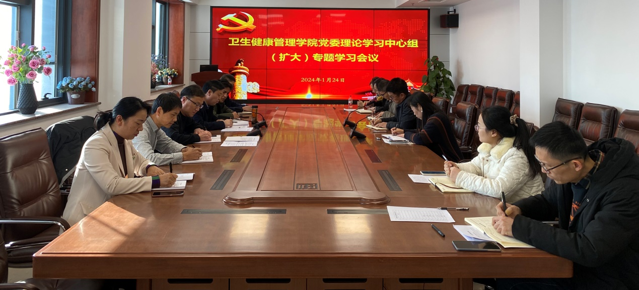 2024年1月24日下午,卫生健康管理学院党委在图书信息楼南楼5楼508会议室召开理论学习中心组(扩大)专题学习会。学院全体处级干部、党政办公室主任、学生工作办公室主任、教学管理与专业建设办公室主任、研究生与科研管理办公室主任、各党支部书记等参加会议。会议由学院党委书记崔金奇主持。