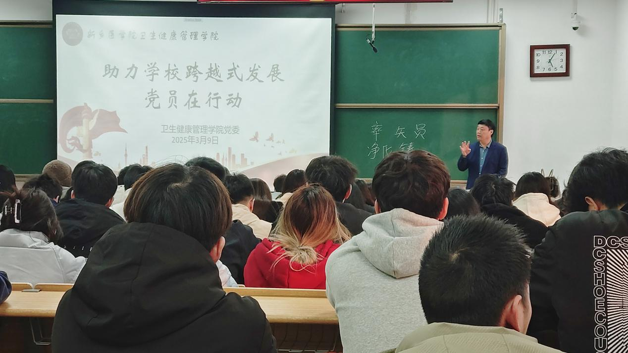 在学校推进跨越式发展的关键时期,卫生健康管理学院党委积极响应学校号召,充分发挥党组织的战斗堡垒作用和党员的先锋模范作用。学院党委于3月9日在唐公山校区109教室组织召开“助力学校跨越式发展,党员在行动”主题会议。学院党委书记崔金奇、特聘教授冯占春、副院长田梅(主持工作)、副院长郭兆红出席会议,各党支部书记及师生党员代表100余人参会。会议由党委副书记高阳主持并作动员讲话。