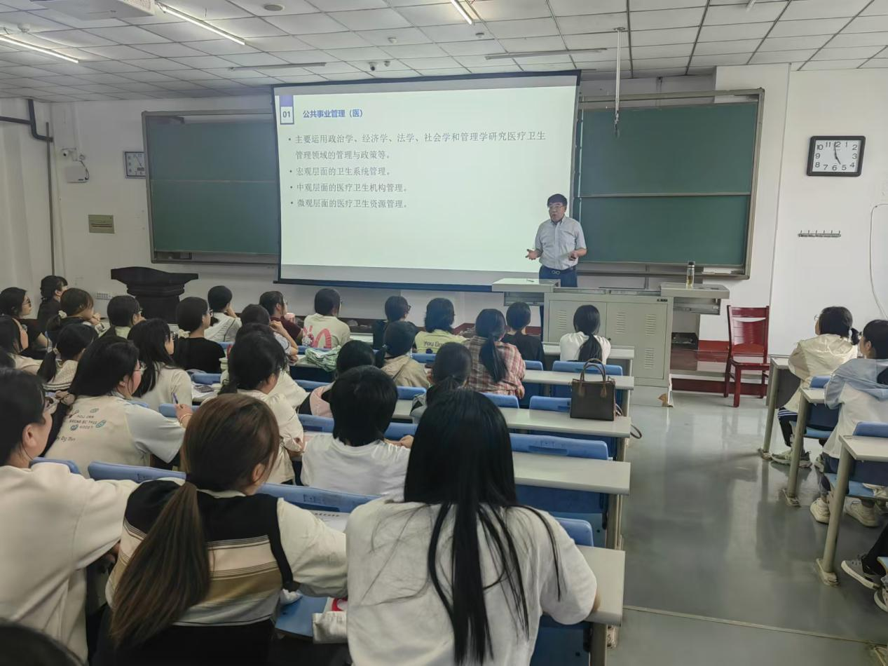 课堂伊始,田梅详尽介绍了学校与学院的概况,通过实例和数据,生动展示了我校悠久的办学历史、先进的教育理念、丰富的教学资源以及优秀的师资力量。针对新生关切的学业发展问题,她强调学院坚持人才立院、特色兴院,以重点发展卫生健康管理学科为引领,以“医药+数智+卫生健康管理”交叉融合为导向培养适应现代医学发展的复合型人才。讲座高潮部分,冯占春从学院人才培养方案、课程设置、实践性教学环节、发展前景及就业概况为大家剖析学院专业开展情况,并勉励新生们珍惜大学时光,刻苦学习专业知识,主动参加学校学院实践活动,全面提高个人素质和能力。