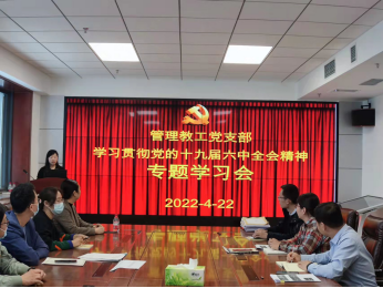 2022年4月22日下午,管理教工党支部召开“学习贯彻党的十九届六中全会精神专题学习会”活动,本次会议由管理教工党支部书记王冉同志主持,管理教工党支部全体党员参加活动。