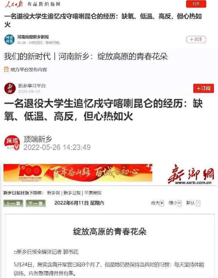 房奕含怀揣着梦想来到火热的军营,“缺氧”“寒冷”“高原反应”这些关卡被她一一攻破,步枪射击、卫生救护、手榴弹投掷……训练项目一个接着一个。“我当时为了顺利通过考核,就连做梦都在练习扔手榴弹。有一次梦到没合格惊醒了,突然从床上坐起来,把战友吓了一大跳。”回忆到这一刻,她禁不住笑了。刻在老营房墙上的这句“头顶烈日乐为祖国守边防,手扶蓝天甘为人民做贡献”,深深的刻在了房奕含的心里。在房奕含看来,个人军旅生活的艰苦在祖国的利益面前都显得微不足道。