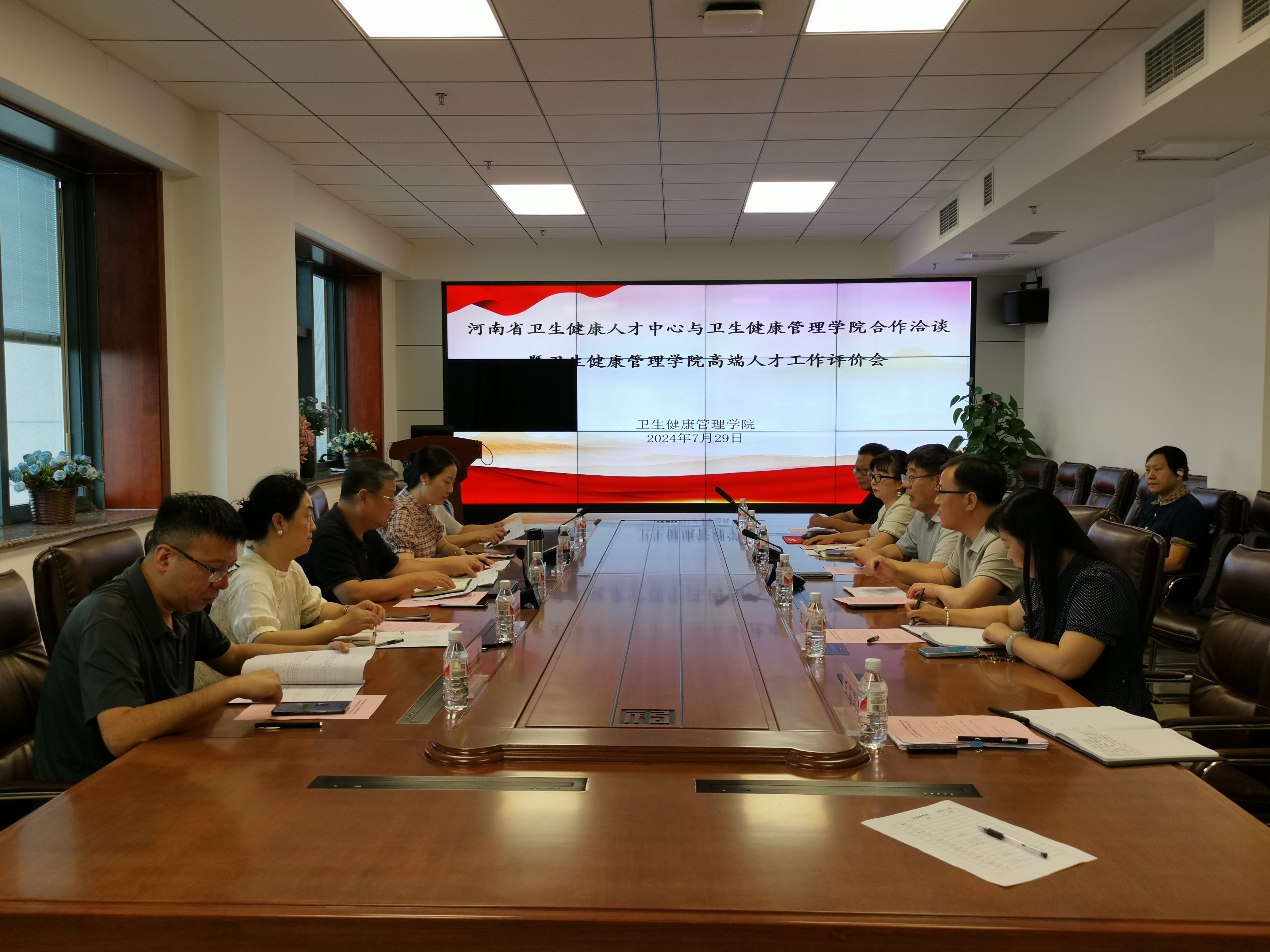 2024年7月29日,河南省卫生健康人才中心与卫生健康管理学院合作洽谈暨卫生健康管理学院高端人才工作评价会在图书信息楼南楼508会议室隆重举行。河南省卫生健康人才中心主任陈益洲、卫生健康管理学院特聘教授冯占春、党委组织部副部长郜佩、人事工作部教师中心主任张睿、人文社会科学学部主任刘雪立、教务部副主任刘巍、卫生健康管理学院党委书记崔金奇、卫生健康管理学院副院长田梅出席会议,学院各科室主任及教师代表等参加会议。会议由崔金奇主持。
