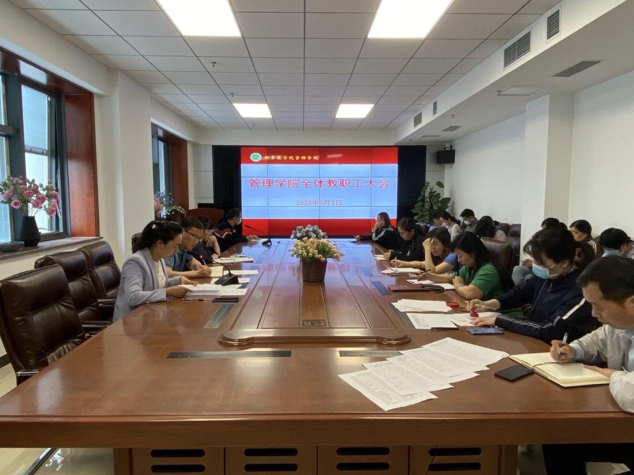 6月2日上午,管理学院在图书信息楼5楼508会议室召开全体教职工大会,学院党政领导班子成员及全体教职工参加会议,会议由管理学院党委书记崔金奇主持。