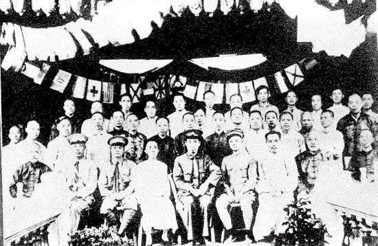 1925年4月26日,广东梅县商会召开欢迎东征军大会。中坐者为周恩来