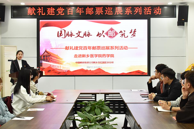为献礼中国共产党建党100周年,深入推进党史学习教育,3月31日下午,药学院党委与新乡市邮政局红旗分局联合举办了——“追忆百年党史,邮传红色精神”邮票展。