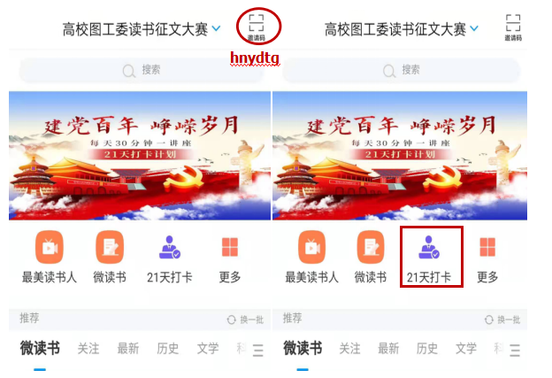 (2)使用手机号注册并绑定学号(若已绑定,请忽略之前步骤),首页右上角点击输入邀请码“hnydtg”(“河南阅读推广”首拼)进入此次比赛首页,点击“21天打卡”参加活动。“21 天读书打卡”活动获奖名单为线上自动抽取。