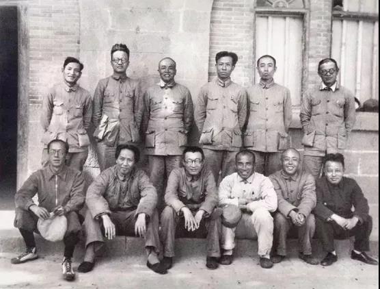 党的扩大的六届六中全会主席团成员合影。前排左起:康生、毛泽东、王稼祥、朱德、项英、王明;后排左起:陈云、博古、彭德怀、刘少奇、周恩来、张闻天。