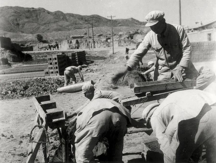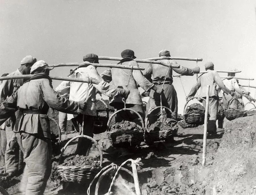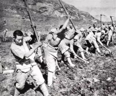 战士们参加改造基本农田建设,他们手里的农具都是自己制作的
