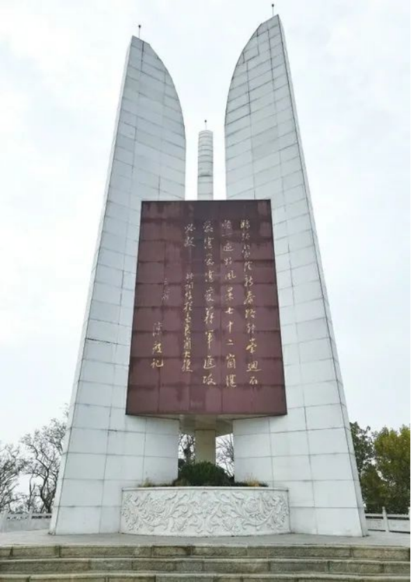 孟良崮战役纪念碑位于山东省临沂市蒙阴县孟良崮山顶。纪念碑碑高30米,由三块状如刺刀的灰色花岗石筑成,象征着华东野战军、地方部队和民兵的武装力量体制。底座为边长20米、高1.6米的正三棱体,组成一个枪托,寓意枪杆子里面出政权。纪念碑的上下部构成一个有机的整体,象征着军民团结必胜、人民战争必胜。碑东面镌刻着陈毅元帅《蒋军必败》诗词:“临沂蒙阴新泰,路转峰回石怪,一遍好风景,七十二崮堪爱。堪爱,堪爱,蒋军进攻必败。”此词作于孟良崮大捷之前。陈毅的词气势磅礴,豪迈有力,充满革命乐观主义精神,绘就了一幅在巍峨壮美的沂蒙山崮中军民同心同力、浴血奋战的历史画卷。孟良崮地貌属构造剥蚀低山丘陵,山顶由于流水侵蚀多呈浑圆状、馒头状及桌状,当地称为“崮”,是闻名的沂蒙山区“七十二崮”之一。这里延绵上百公里的大规模断裂地貌特征,呈弧形弯曲,确实是“路转峰回石怪”。这首诗词穿越时空,重回烽火连天、硝烟弥漫的激情岁月,感悟革命情怀,汲取奋勇向前的精神动力。