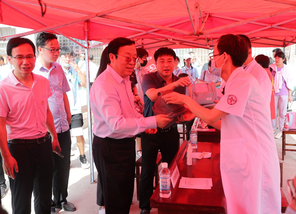 调研期间,我校五所附属医院派出的五支医疗卫生志愿服务团,送医下乡为当地群众提供专业医疗卫生服务,郝红军亲切慰问专家教授与各实践团队成员,并为他们送上了慰问品。