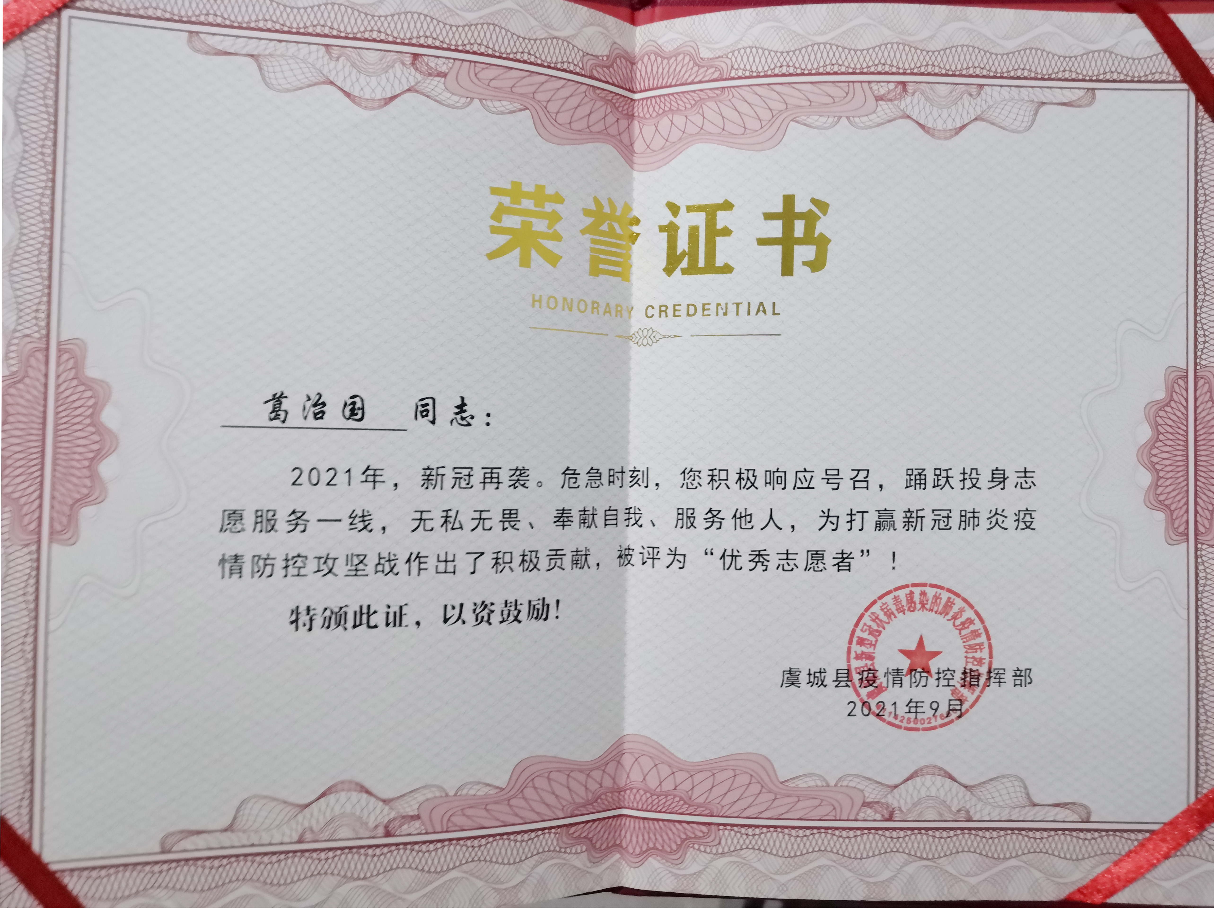 越是危难时刻,越显责任担当。我校第三临床学院学生葛治国挺身而出,深入中高风险区河南省商丘市虞城县刘集乡参与志愿服务,被虞城县评为“优秀志愿者”。葛治国在接受疫情防护及工作知识培训后,迅速投入工作岗位,街道消杀、核酸现场秩序维护、信息登记等,连续开展了为期30天的早八点到凌晨十二点的志愿工作。在接受表扬时葛治国提到,他只是众多大学生志愿者中的普通一员,作为医学生,从踏入医学殿堂的那一刻起,便决心在国家和人民需要的时候,义不容辞奉献个人力量。葛治国的志愿事迹受到虞城县电视台、东方今报媒体报道,被今日头条、大象新闻媒体转载。