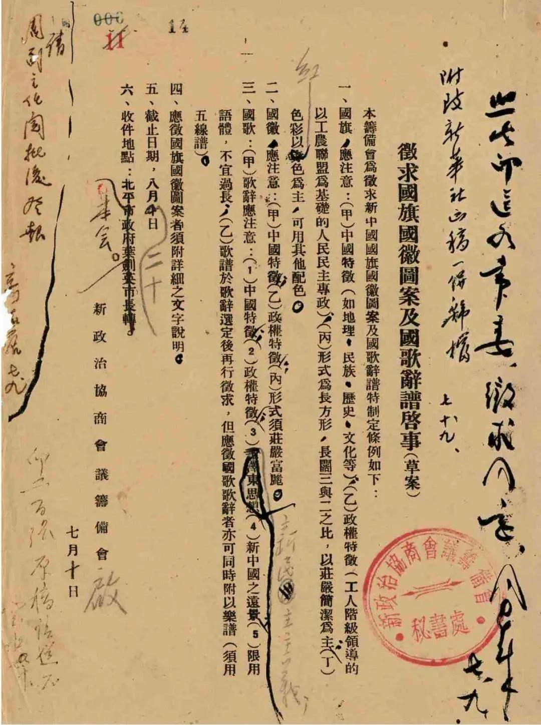 筹备会第六小组起草的《征求国旗国徽图案及国歌辞谱启事》(草案)