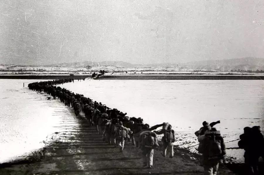 1951年1月4日晚,志愿军第50、第39军各一部及朝鲜人民军第1军团解放了汉城。8日又乘胜进军仁川,直逼“三七线”附近。图为志愿军攻克汉城后,冒着炮火渡过汉江。