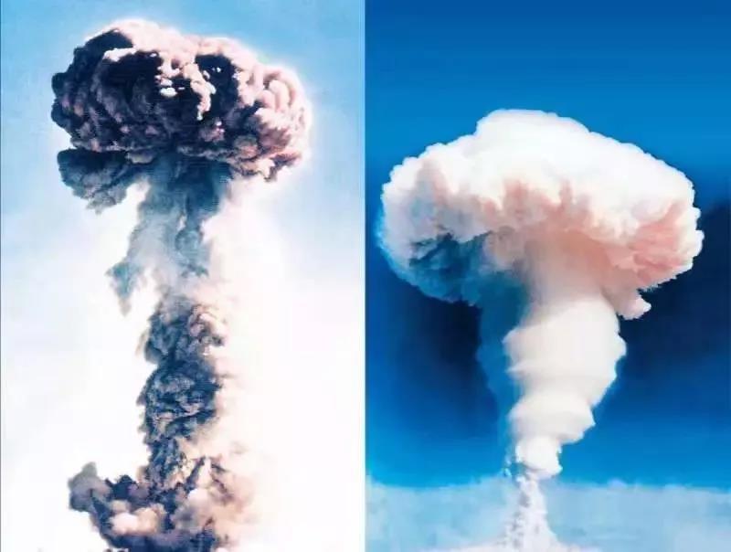 1964年10月16日我国第一颗原子弹爆炸成功,1967年6月17日我国第一颗氢弹空爆试验成功,图左为原子弹爆炸情景,右为氢弹爆炸情景