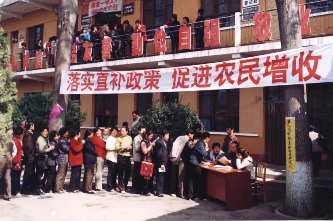 2004年4月,山西省临汾市曲沃县乐昌镇西南街村委会发放直补补贴款现场。国家粮食直补是指为稳定和发展粮食生产,保护种粮农民利益,将以往国家给予国有粮食企业的补贴资金改为直接补贴给种粮农民的政策。