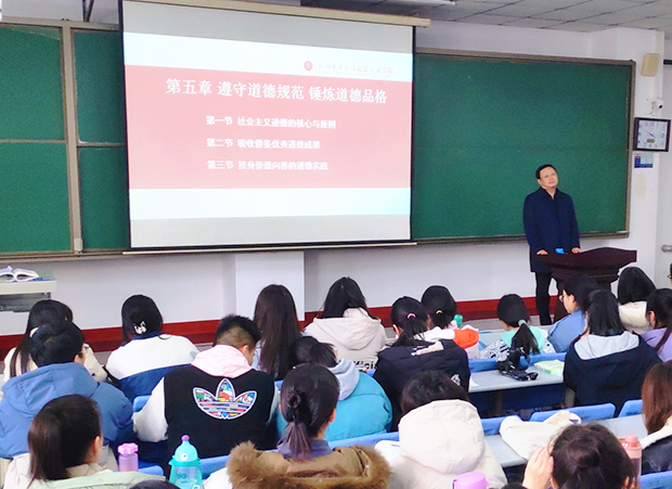 课堂上,靳新峰指出,大学时期是道德观形成和发展的重要阶段,在这个时期形成的道德观念对大学生一生影响很大。大学生提高自身的道德素质, 需要认真学习道德的基本理论,树立马克思主义道德观,弘扬社会主义道德,自觉传承中华传统美德和中国革命道德,积极吸收借鉴人类优秀道德成果,在崇德、向善的实践中不断锤炼道德品格、提升道德境界,同时要以开放的胸怀和视野吸收借鉴人类文明的优秀道德成果,不断深化对社会主义道德的认识。课堂讲授内容丰富,生动有趣,深入浅出,联系实际,给人启发,催人奋进,极大地调动了同学们的学习积极性,引来学生阵阵掌声。(供稿:杜昌建)