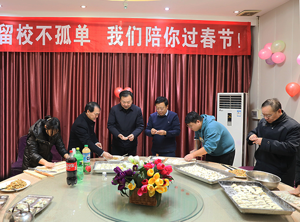 校领导一行人与同学们围在一起,一边包饺子一边话家常,先是询问同学们留校生活情况,又是交代同学们在学校要加强锻炼,好好学习,每天与家人通电话报平安,有困难及时跟老师反映等,生活学习等事无巨细一一嘱托。师生们还互相送上新春祝福,欢声笑语此起彼伏,回荡整个餐厅。