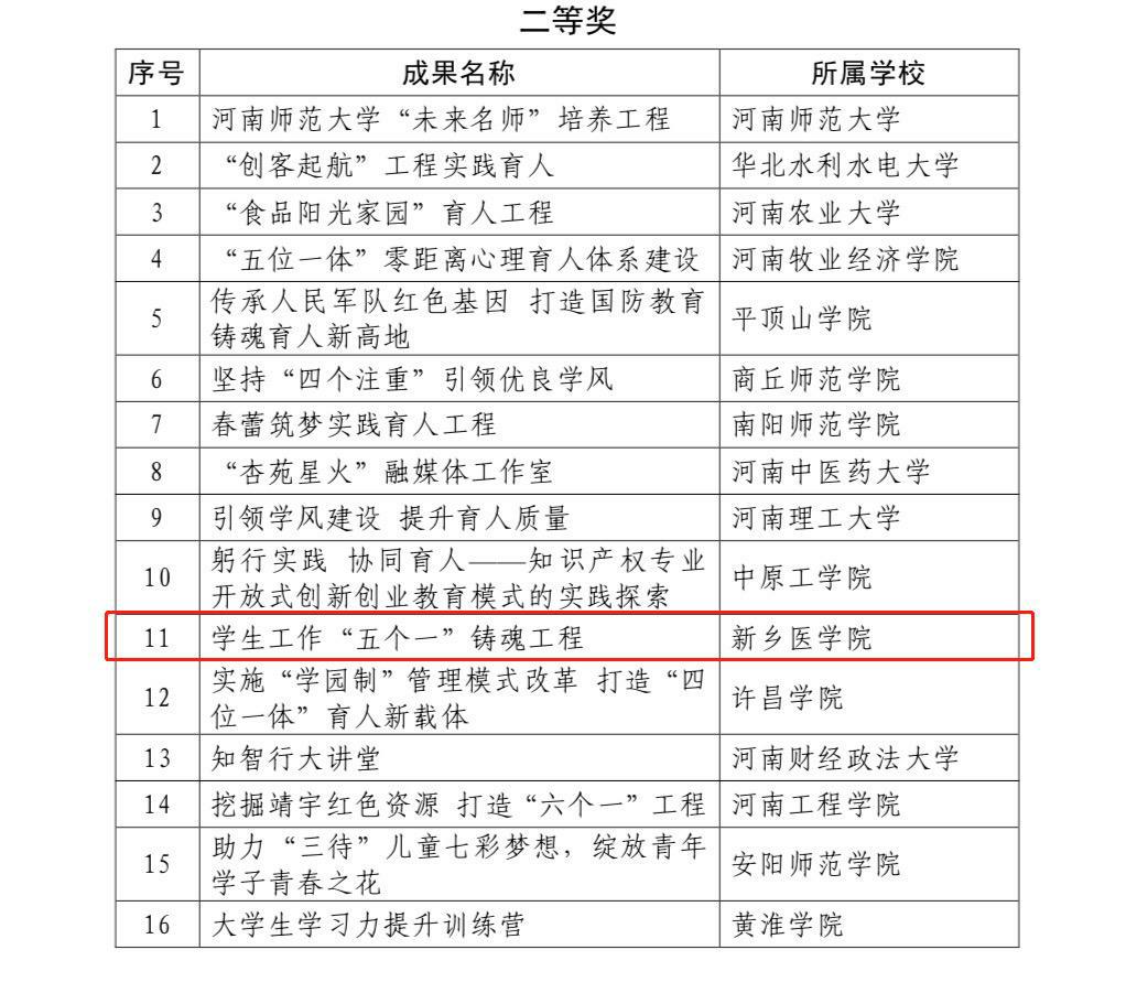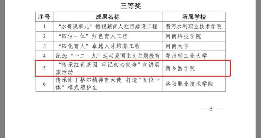 近日,河南省教育厅下发《关于表彰2020年普通高等学校学生工作优秀成果的决定》(教学〔2021〕5号),我校有两项学生工作成果获得佳绩。其中,《学生工作“五个一”铸魂工程 》荣获二等奖,由《“传承红色基因 牢记初心使命”宣讲展演活动》荣获三等奖。