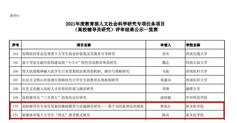 2021年8月3日,教育部社科司发布《关于2021年度教育部人文社会科学研究一般项目评审结果的公示》,我校郭兆红老师的研究课题《高校辅导员专业化发展的激励模型与实施路径研究——基于双因素理论的视角》、陈冉老师的研究课题《新媒体环境下大学生“四史”教育模式研究》获得立项!