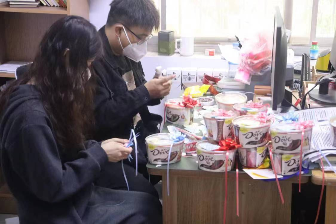 图三:辅导员老师为学生分发巧克力,用爱制造小惊喜