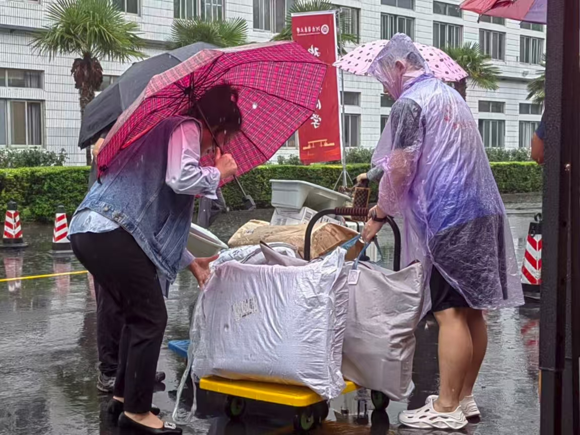 针对雨天搬运行李的困难,大学生自律委员会的同学们主动承担起新生行李转运工作。他们主动接过家长手中的行李箱、被褥等大件物品,通过手推车转运与人力搬运相结合的方式,快速往返于报到点与宿舍区之间。转运过程中,同学们始终将行李防护放在首位,用自身雨衣遮盖物品避免受潮,同时仔细观察路况,引导家长避开积水与湿滑区域。即便雨水打湿衣物,大家仍坚守岗位,以高效服务切实解决了新生“雨中负重”的难题,认真负责的态度赢得了广泛赞许。
