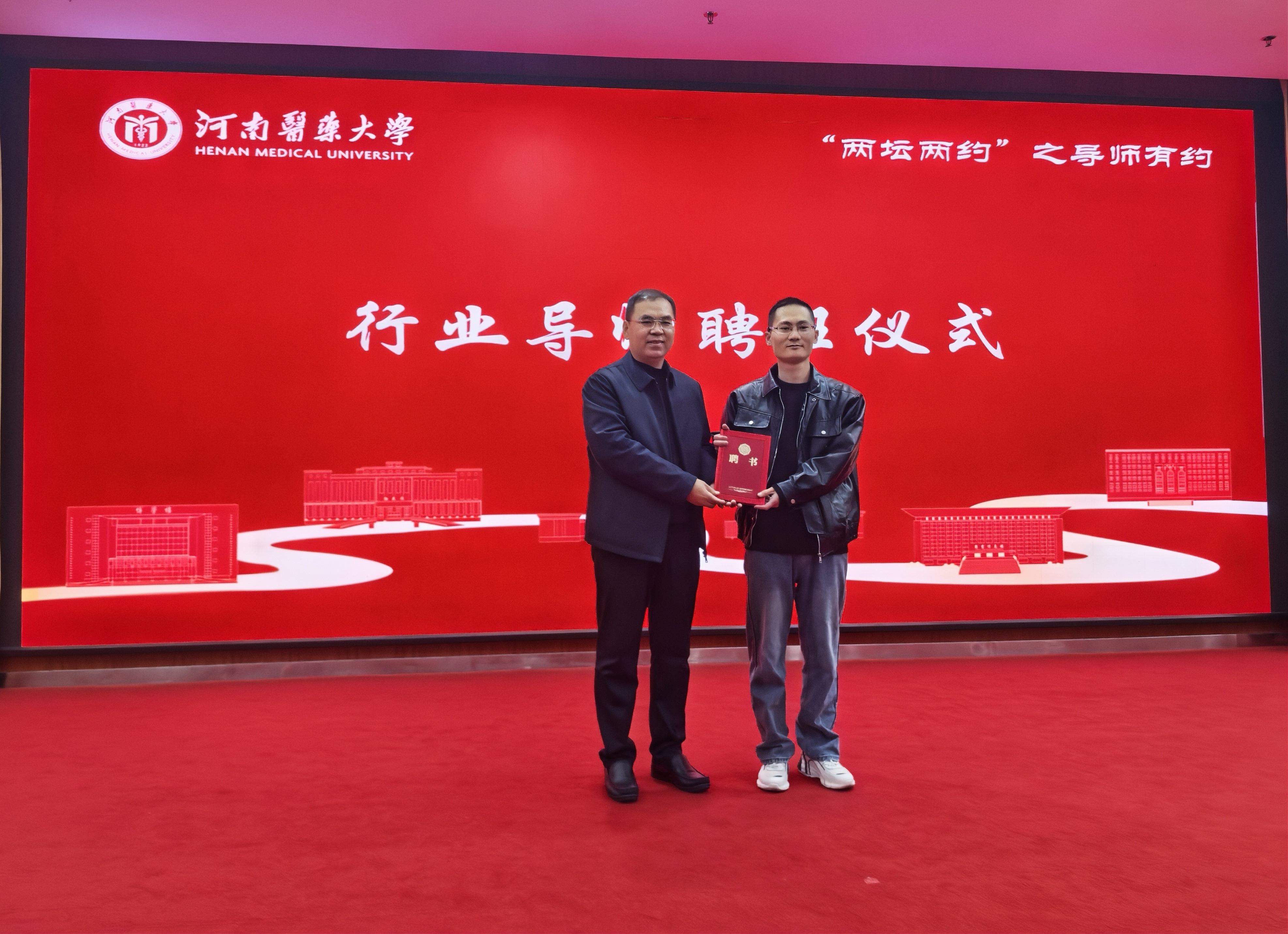 讲座伊始,林俊堂发表致辞。他首先对师振鹏校友荣归母校表示热烈欢迎,对其长期以来给予母校工作的关心与支持致以诚挚感谢;随后勉励全体同学树立远大理想,以敢为人先的创造热情和勇攀高峰的超越意识,锤炼专业本领、勇担时代使命,努力成长为德才兼备的优秀人才,为我国医药卫生事业的高质量发展贡献青春智慧与力量。致辞完毕,林俊堂为师振鹏颁发行业导师聘书。