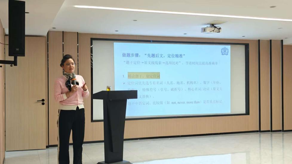 最后,在应试策略方面,她建议采取“先易后难”的顺序:优先完成逻辑题、固定搭配题,再处理需结合语境的词汇辨析题;遇到难题可暂时标记,通读全文后再回头推敲。整场讲座内容详实、条理清晰,为备考学子提供了清晰思路与实操方法。