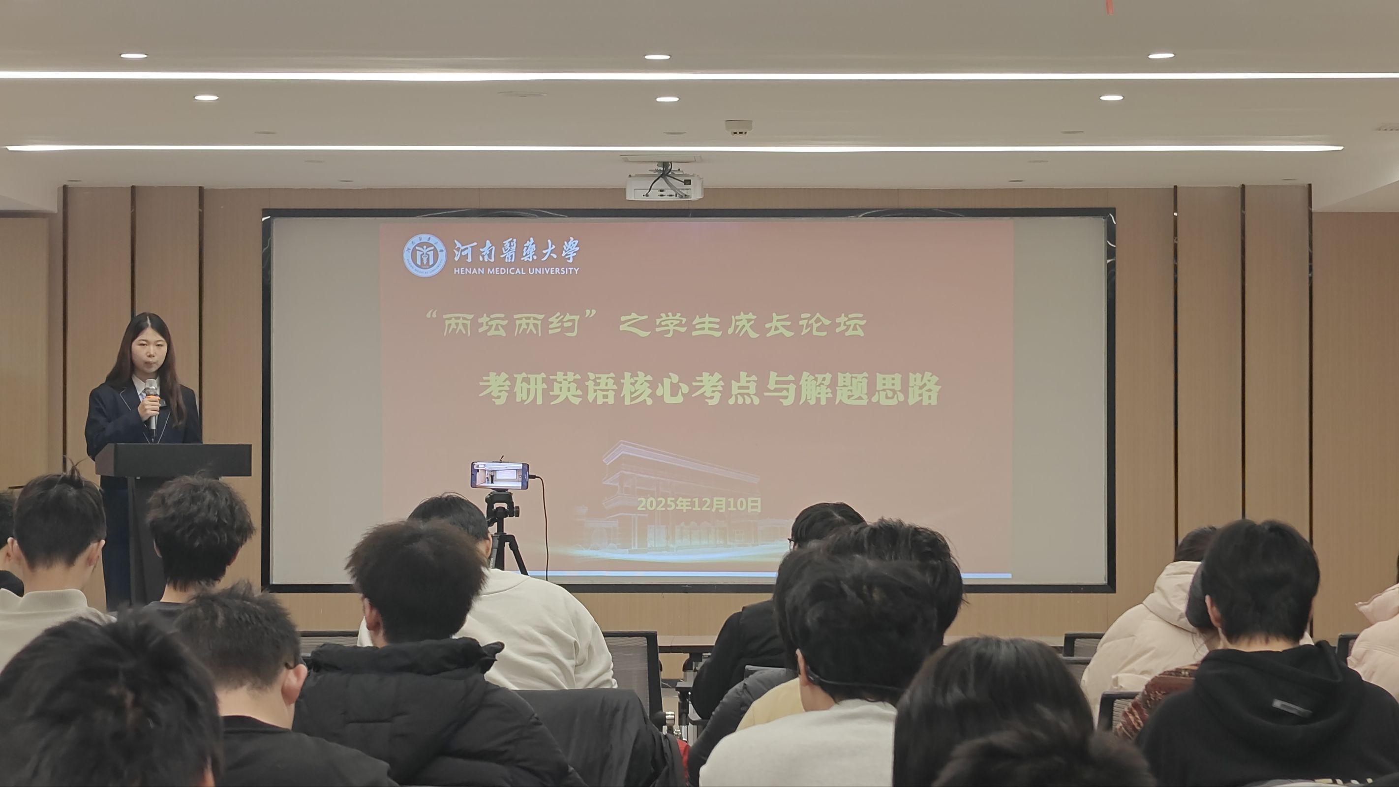 为助力我校学子精准把握考研方向、夯实学科基础,实现知识传授与价值引领相统一,2025年12月10日至11日,由河南医药大学本科生学院、学生中心主办,第五临床学院承办的“两坛两约”学生成长论坛系列讲座,在南校区创新创业学院路演大厅顺利举行。