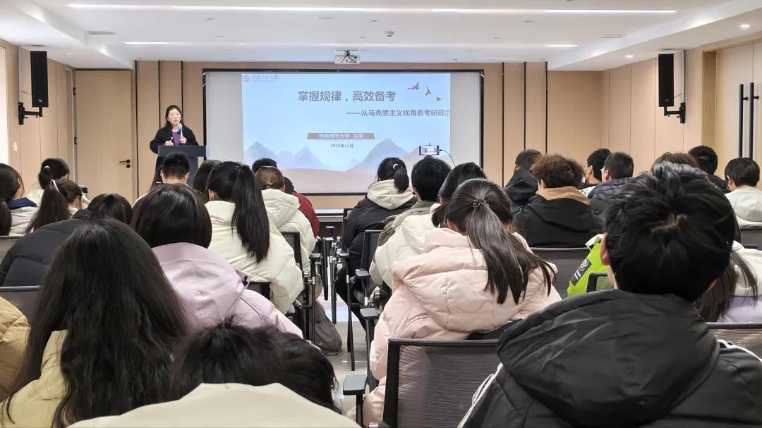 在政治专题讲座中,王瑶老师以“看清本质、高效突击、把握关键、解读时政、长远规划、冲刺备考”为主线展开讲解。首先从考研政治的内在逻辑与学习要领入手,系统梳理政治科目五门课程的核心要点,提供针对性的复习路径与答题方法,并运用矛盾分析法,阐释“抓住不变核心,应对形式变化”的备考策略。其次在复习规划方面,提出“三轮冲刺计划”,答题策略上,她推荐“原理—阐释—结合—升华”四步作答法,强调卷面整洁、分点陈述与答案完整度等实战技巧。