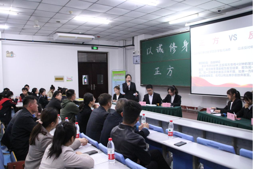 本次赛事分上下两场,共有四支队伍进入决赛。双方就“该不该反对申请助学贷款学生高消费”、“诚信主要靠他律还是自律”两个辩题展开激烈对决。赛场上双方辩手妙语连珠、唇枪舌战,扎根专业知识,从学生耳濡目染的实例出发侃侃而谈,赛事全程紧张激烈、扣人心弦,现场掌声不断。