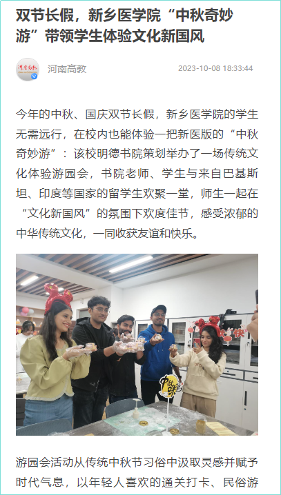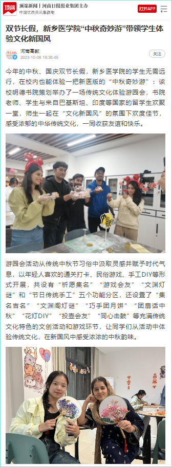 【河南高教、大河报豫视频】等媒体报道明德书院“中秋奇妙游”让中外学子体验文化新国风