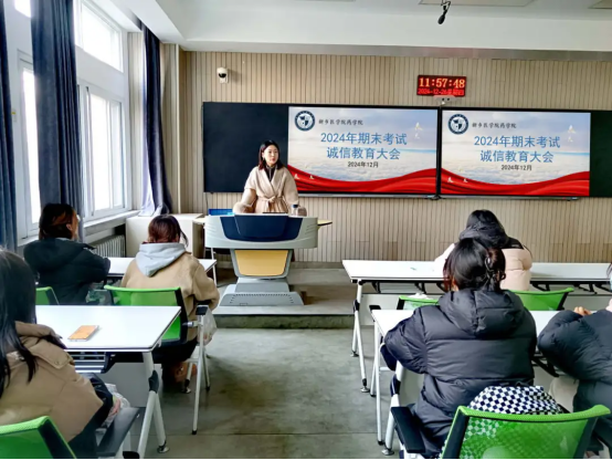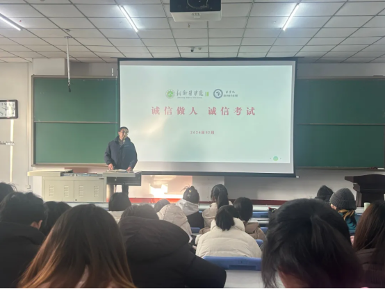 辅导员武悦老师着重指出诚信是教育的基石,也是个人道德修养的关键体现。在考试中,任何作弊行为都严重违背了教育的初衷和公平原则,她结合学校以往发生的考试违纪案例,进行深入剖析,让学生认识到违反考试纪律的严重性,告诫学生们要坚守诚信底线,切莫因一时的侥幸心理而抱憾终身。