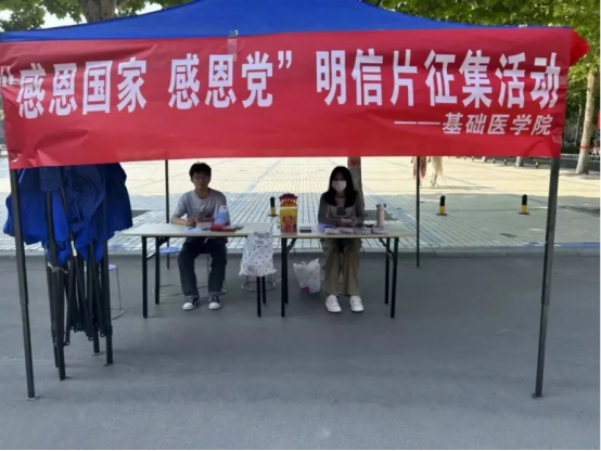 为深入学习贯彻习近平新时代中国特色社会主义思想,进一步发挥资助育人在立德树人根本任务中的关键作用,培养具有坚定理想信念、深厚家国情怀、强烈责任担当的德智体美劳全面发展的时代新人,4月27日,我校基础医学院在南校区五环广场开展以“感恩国家,感恩党”为主题的明信片征集活动。