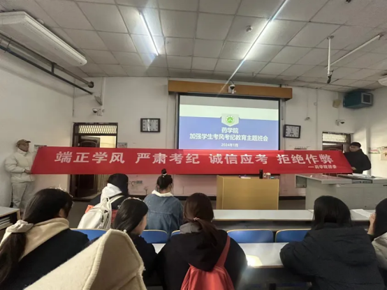 辅导员王栋老师强调古人云:“人无信,不知其可也”,“车无辕而不行,人无信则不立”, 诚信自古以来就是中华民族的传统美德。我院历来重视学风建设及考风考纪教育工作,考试作弊是严抓细管的重点,尤其是本次期末考试教务部将联合本科生学院加大考试作弊的巡查力度,一经发现有违反考场纪律者将严肃处理,要求学生们不得存在侥幸心理,务必诚信应考。
