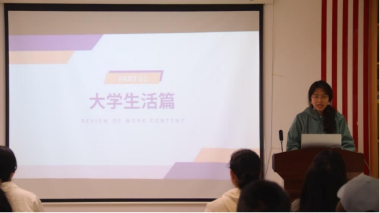 分享会上,六位国奖获得者杜雪纯、杨怡涵、田佳奇、杨雅欣、孙萌钦、李贝贝同学依次上台分享,结合自身的学习与生活经历,详细介绍了各自在学业规划、科研创新、社会实践等方面的成长故事。杜雪纯同学提到“实践出真知”的道理,分享了自己参加的团课和各种志愿社会实践活动,提出了要明确思想灯塔以照亮前行之路,把课本上学到的知识应用到实处;杨怡涵同学强调要用专业知识来武装自己,分享了自己独特的专业学习方法,并鼓励大家找到适合自己的学习方法以高效学习;田佳奇同学则介绍了如何应用布尔逻辑运算来检索文献,并向我们具体演示了学校图书馆文献检索系统文献检索的流程;杨雅欣同学告诉我们要多和老师沟通,寻求老师的专业帮助,并要善于把握时机,机会都是争取来的;孙萌钦同学通过自身去剑桥交流学习的经历,鼓励我们多开阔眼界,与外界进行思想碰撞与交流;李贝贝同学结合自身的经历告诉我们人都会犯错,不要害怕,要勇于承认,敢于担当,脚踏实地地走好每一步,“看似不起波澜的日复一日,会突然在某一天让我们看到坚持的意义”。分享会帷幕初落,潮水般的掌声便自观众席间翻涌而起。