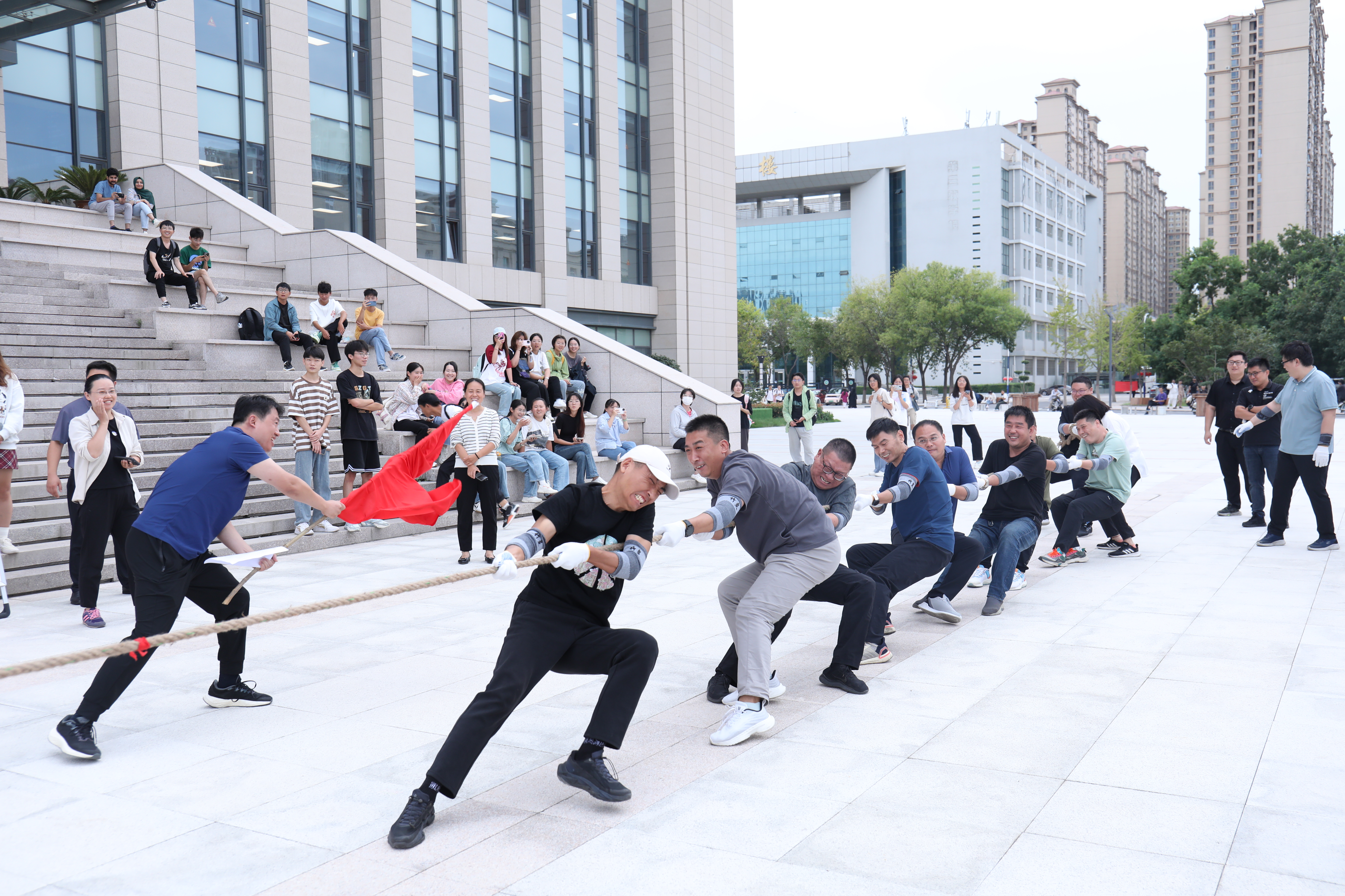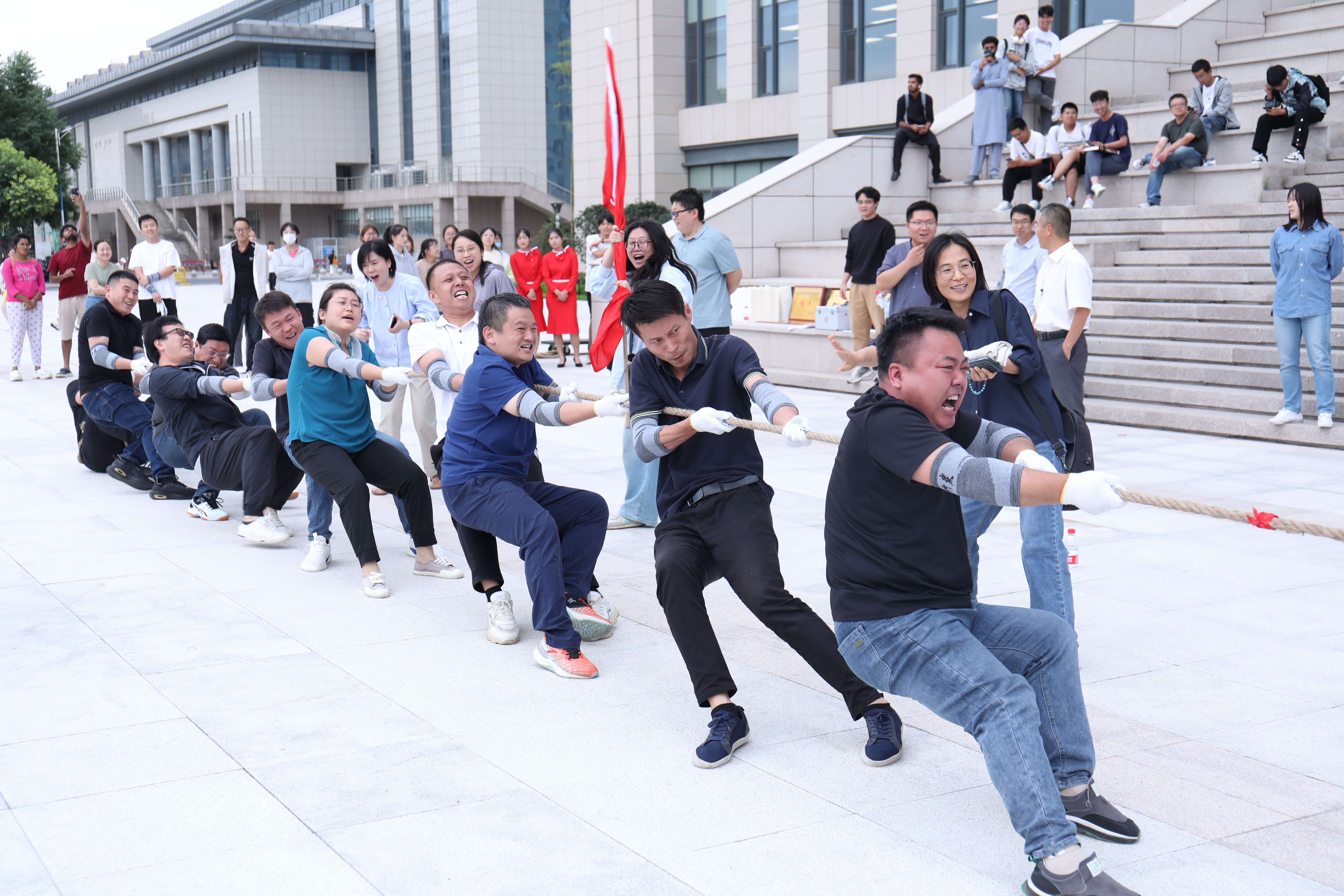 此次比赛共有八支队伍参赛,每队12人,其中领队1名,监督员1名,参赛选手10名。比赛实行淘汰制晋级方式,各小组抽签决定比赛顺序。当比赛的哨声响起,每支代表队都显示出最强的比赛阵容,大家默契配合、齐心协力,一起高呼着“一二,一二”的号子声,双手紧握长绳,憋足了劲拼命往后拉;未参赛人员自发组成啦啦队在队伍旁边助阵加油,恨不得抓起绳子一起努力。号子声、呐喊声,此起彼伏,飘荡在整个广场上空。经过激烈的角逐,由教务部、发展规划部组成的第五组参赛队获得冠军;由党委组织部、保卫处、国有资产管理处组成的第二组参赛队获得亚军;由审计事务部、党政办公室、党委统战部、科技发展部组成的第一组参赛队和后勤组成的第七组参赛队获得季军;其他四组参赛队获得纪念奖。