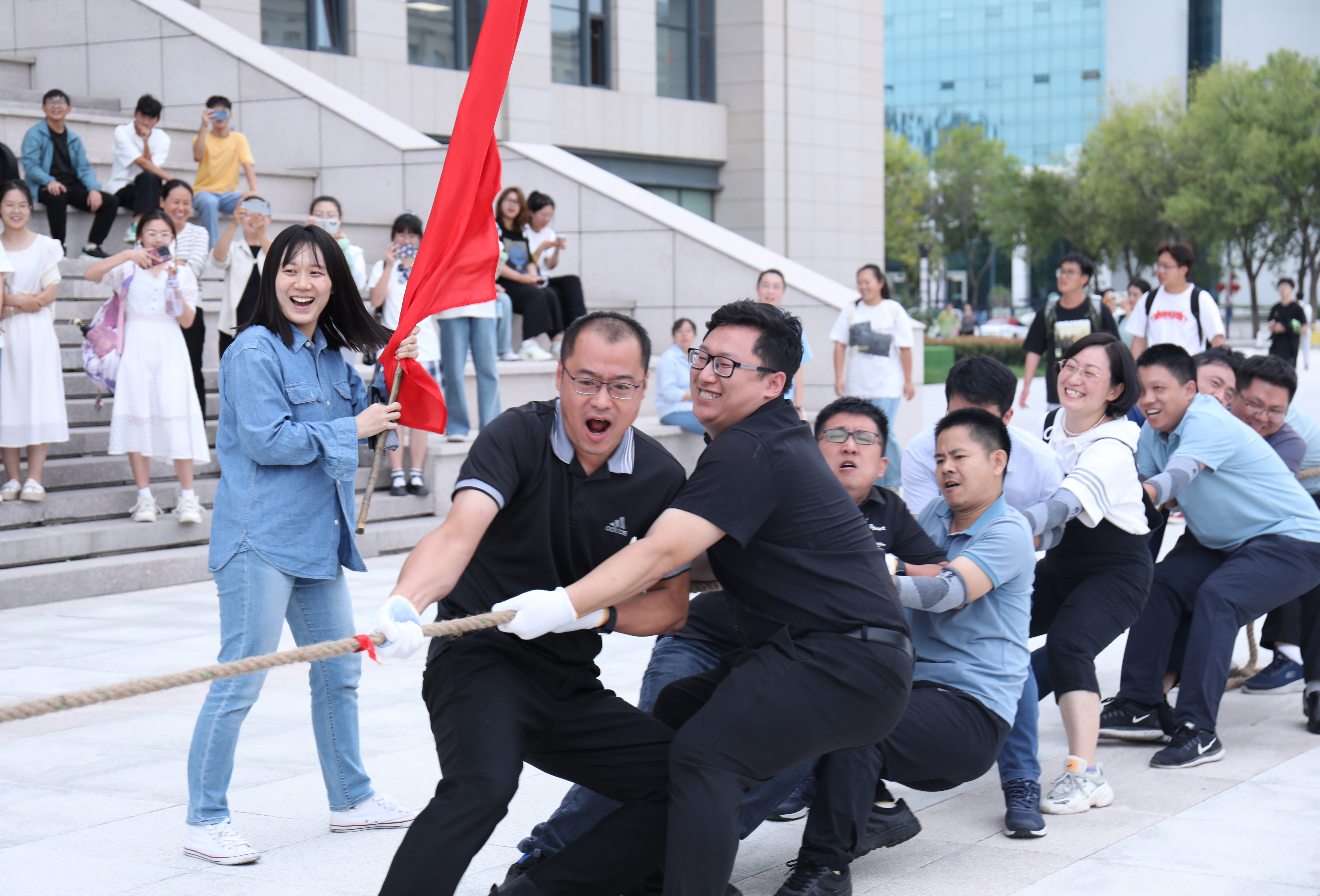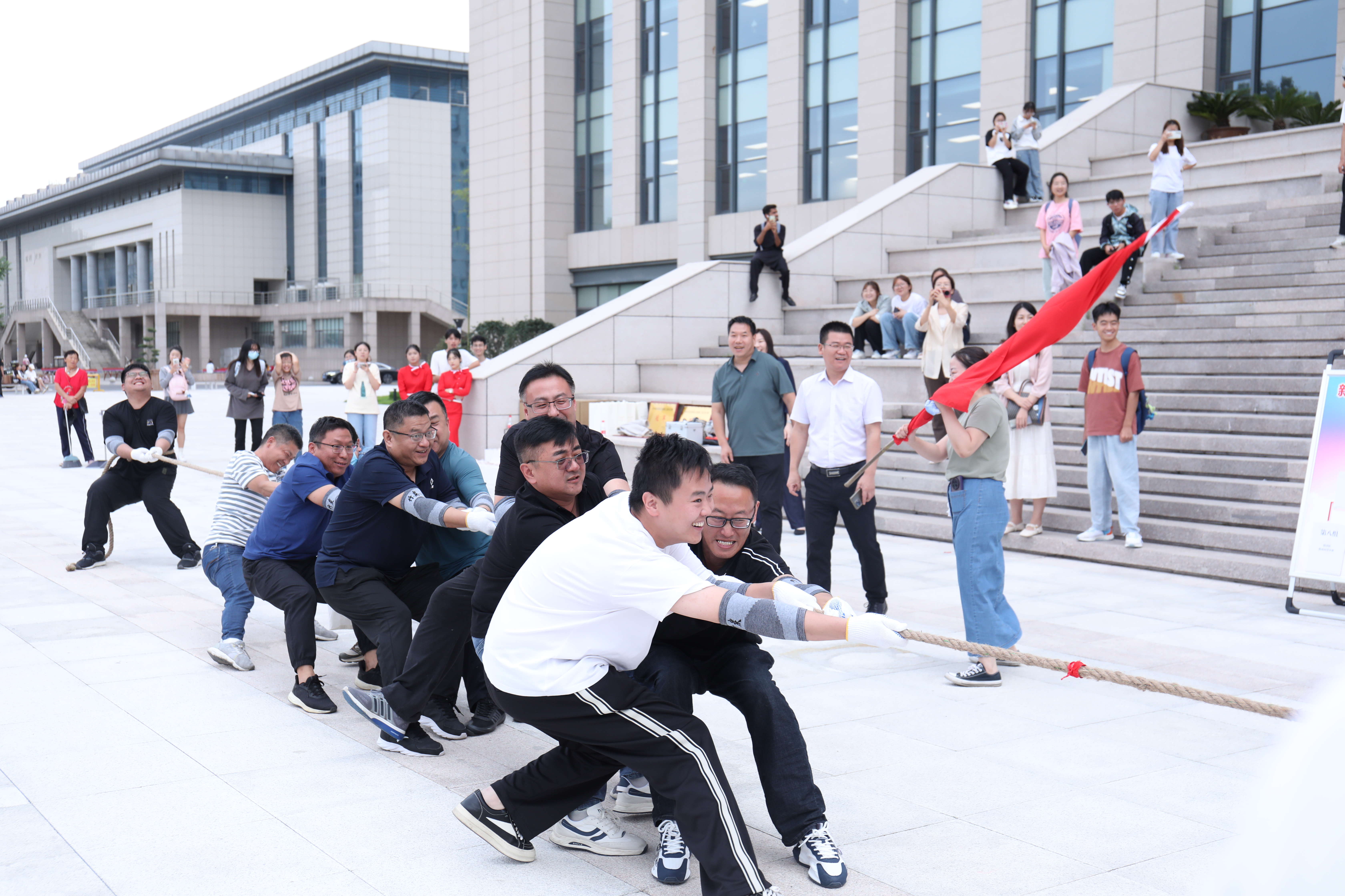 为庆祝新中国成立74周年,丰富和活跃我校机关教职工的文体生活,树立新形象,增强机关党组织的引领力和凝聚力,9月22日下午,机关工会在图书信息楼北侧广场举行“活力机关·给力机关·魅力机关”主题拔河比赛。机关党委书记、组织部副部长、党校副校长郜佩,校工会副主席、女职工委员会主任武俊芳,机关党委副书记、工会主席雷好利及参赛队员、啦啦队参加活动。