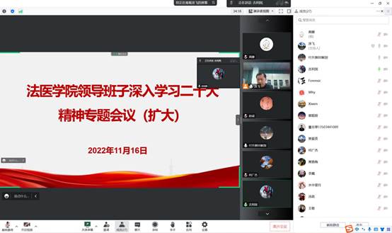 (文/王敬,图/涂飞)11月16日,法医学院召开领导班子深入学习党的二十大精神专题会议(扩大),传达学习党的二十大精神,部署学习宣传贯彻工作。本次会议采取线上线下相结合的学习方式进行,全体党政领导班子在求真楼443会议室参会,各个教师党员在线上参加会议。会议由院党委负责人李照勇主持。