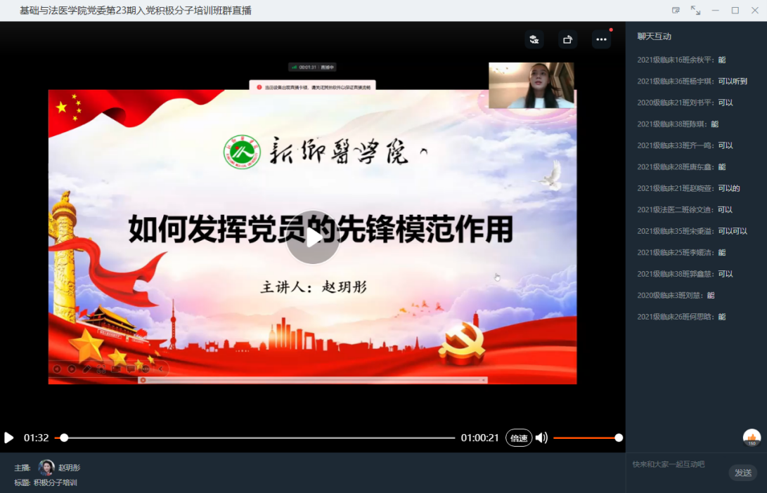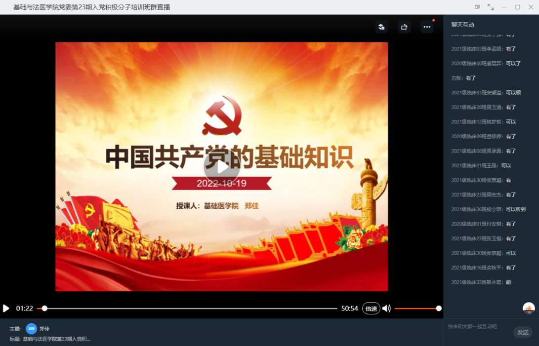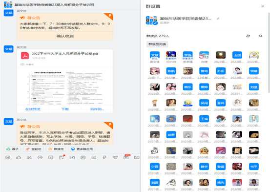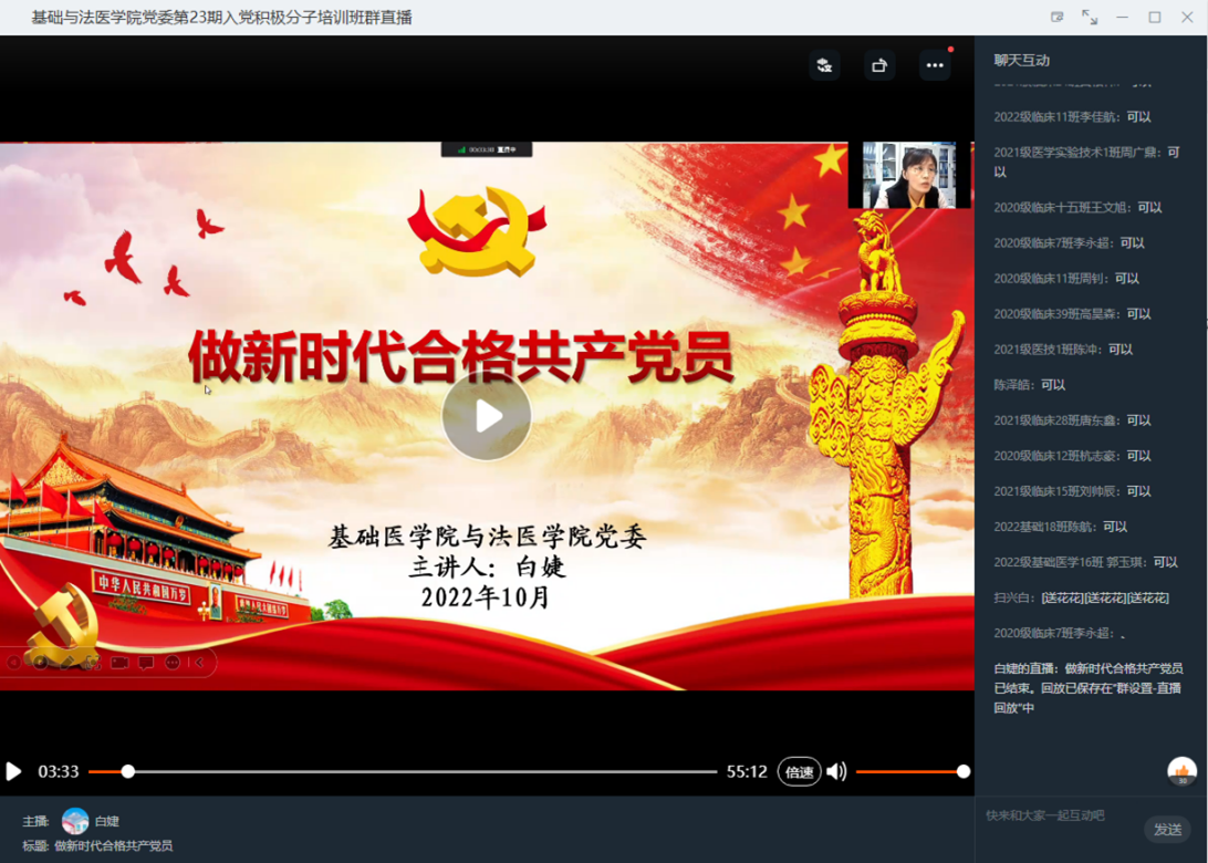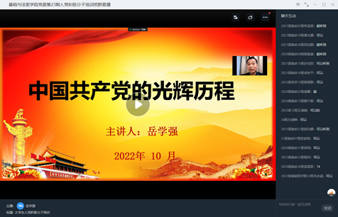 2022年10月18日至21日,基础医学院与法医学院党委组织开展了第二十三期入党积极分子培训班。按照培训大纲要求,围绕立德树人的根本任务,本次培训结合疫情防控要求,采用了钉钉线上教学的方式进行,共计269名积极分子参加本次培训。