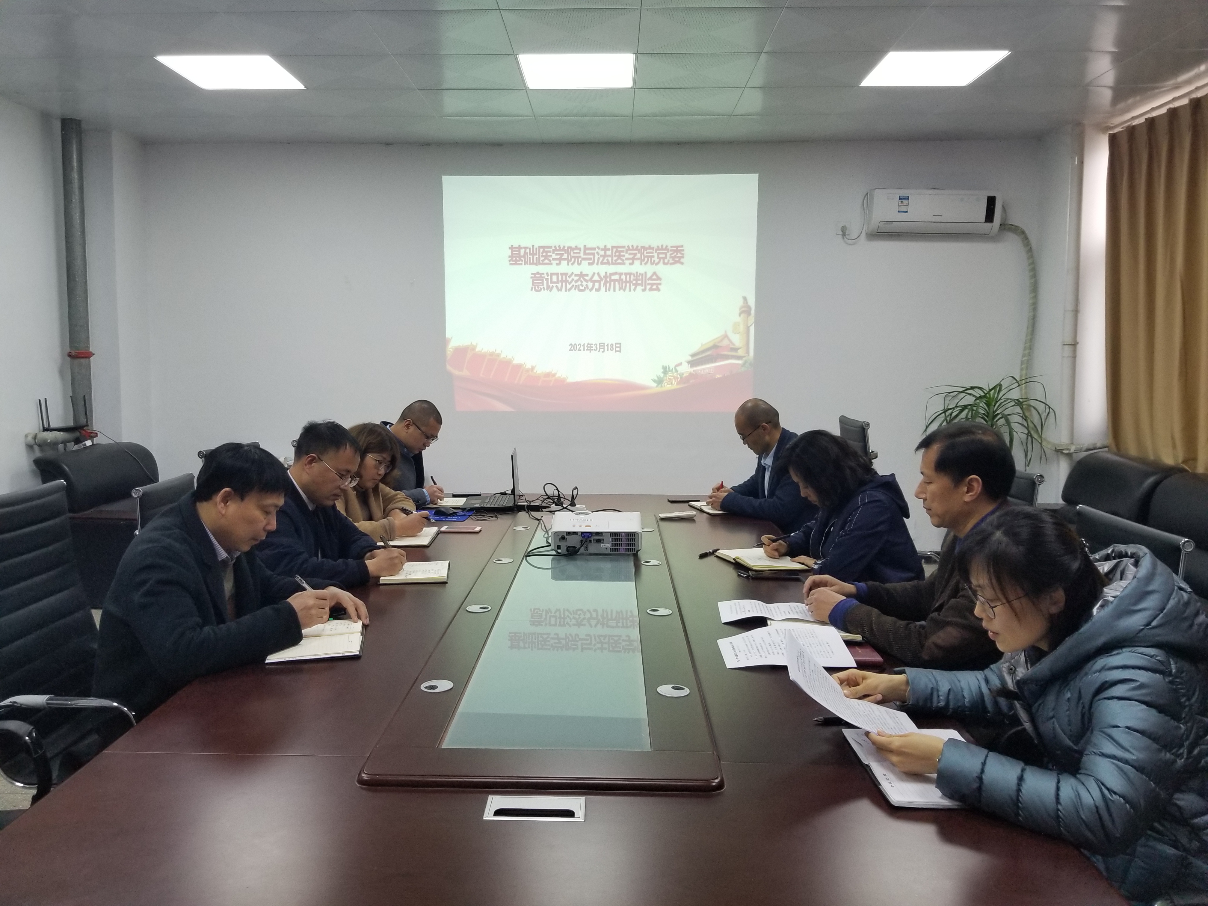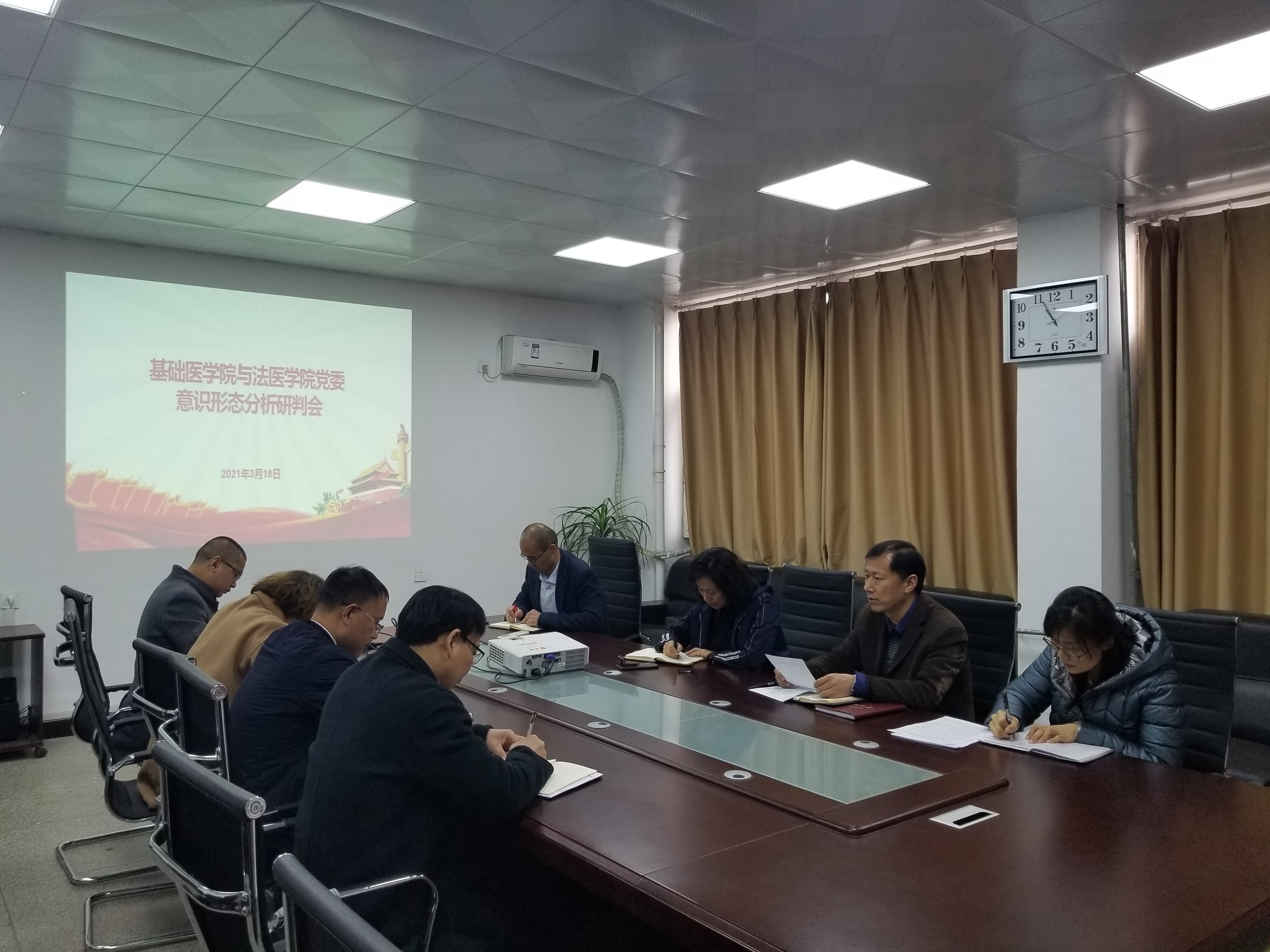 (文/涂飞 图/李鹏)3月18日上午,基础医学院与法医学院党委在实验楼东配楼三楼331会议室召开2021年第一季度意识形态工作分析研判会,基础医学院院长任峰,基础医学院与法医学院党委副书记李照勇、白婕,基础医学院副院长赵晓生及法医学院副院长付升旗、何广杰参加会议。会议由李照勇主持。