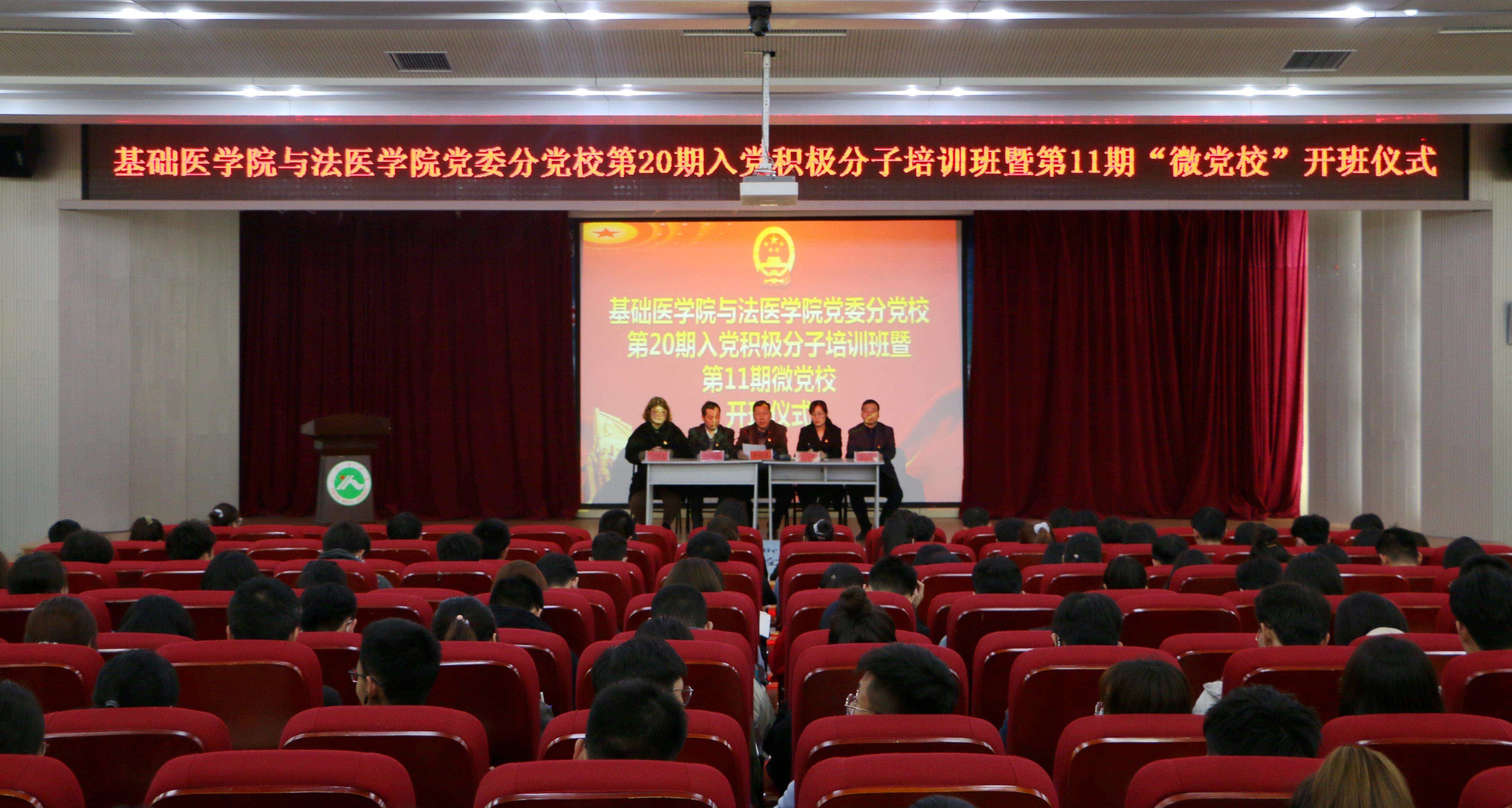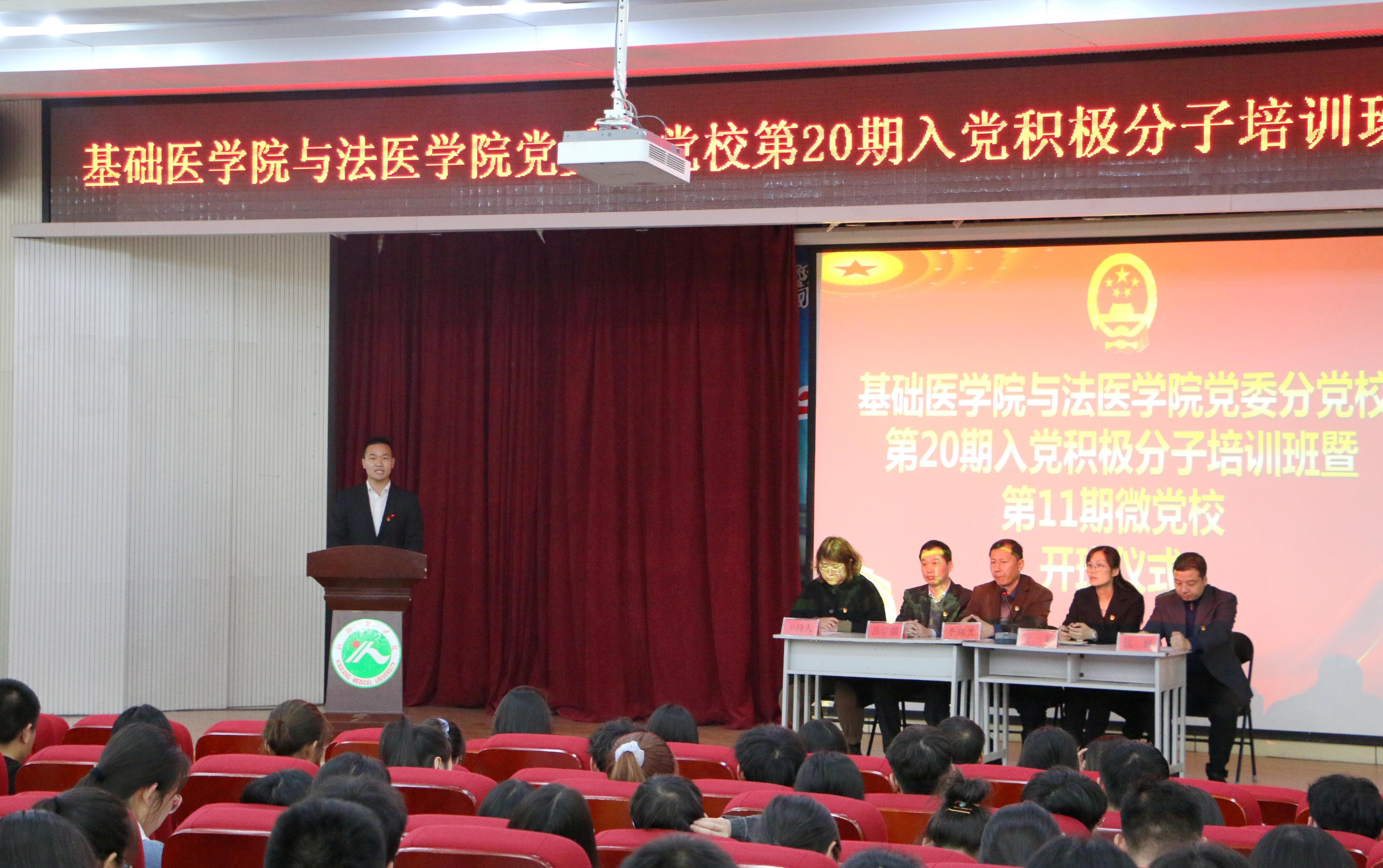 3月26日下午17:30,在庄严的国歌声中,第20期入党积极分子培训班暨第11期微党校开班典礼在西校区问学楼第一报告厅拉开了序幕,党委副书记白婕宣读了《基础医学院与法医学院党委分党校第20期入党积极分子培训班课程安排》,并从党校培训时间、内容、方式、结业方式和纪律要求等五个方面进行了安排和部署,并希望同学们珍惜此次培训机会。