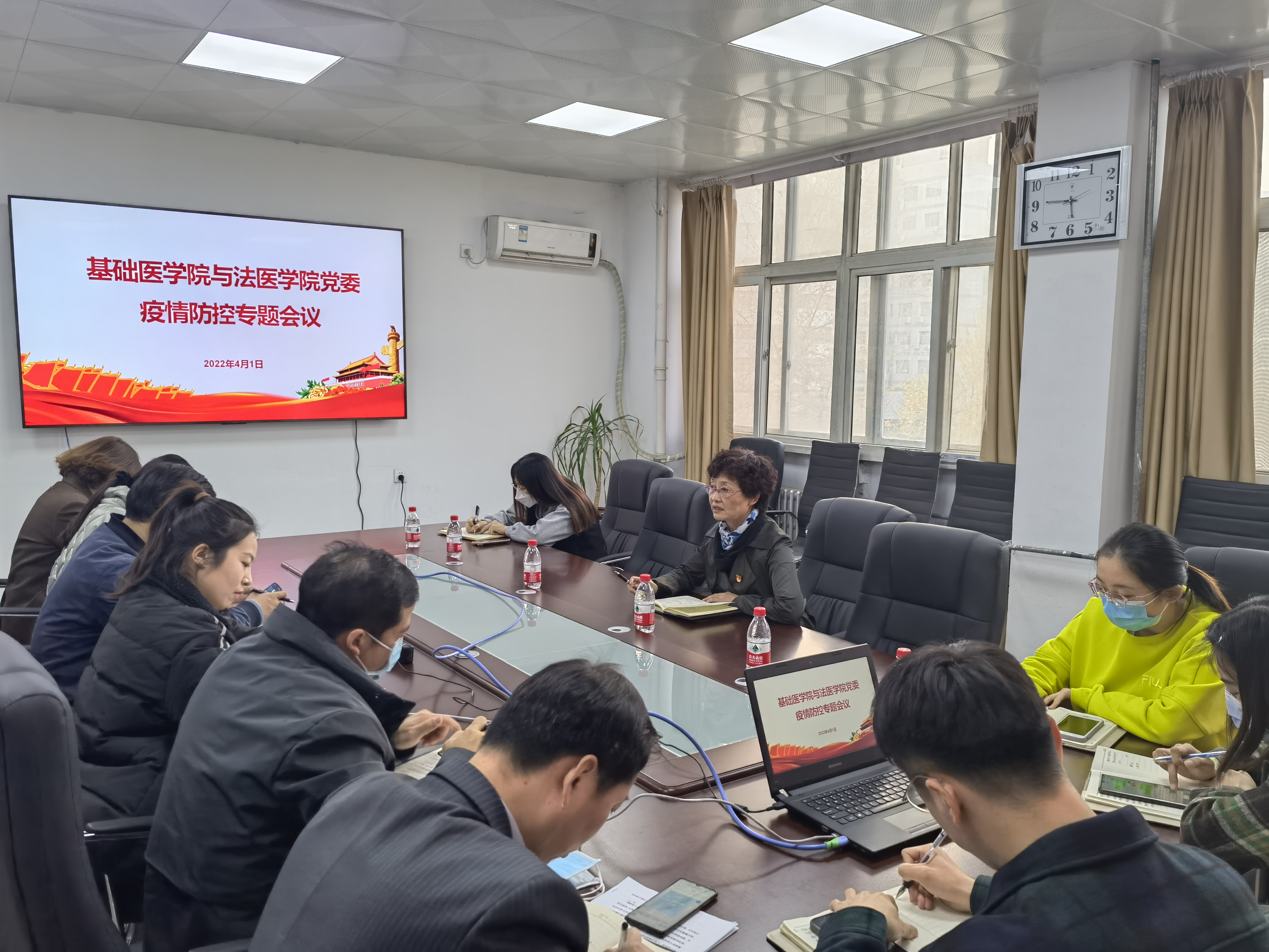 (文/图 王敬)4月1日下午,基础医学院与法医学院党委在求真楼331会议室召开疫情防控专题会议。基础医学院与法医学院党委书记王宏玲、基础医学院与法医学院党委副书记李照勇、白婕出席会议,党政办、教学办、学工办、研究生负责人参加会议。王宏玲主持会议并讲话。