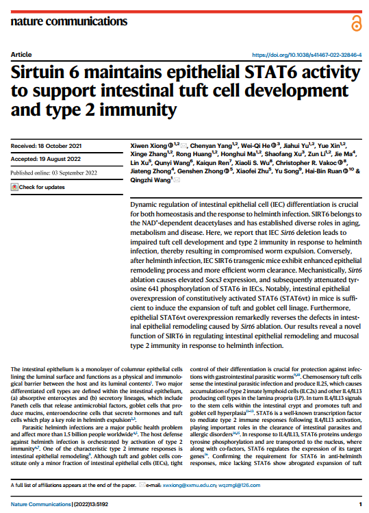 近日,国际知名综合性期刊《Nature Communications》在线发表了我院熊熙文博士团队的研究成果《Sirtuin 6 maintains epithelial STAT6 activity to support intestinal tuft cell development and type 2 immunity》。该成果以法医学院为第一作者单位和唯一通讯单位,所有主要的实验工作均在法医学院所属的新乡市代谢与整合生理学重点实验室中完成。熊熙文博士为第一作者兼通讯作者,王庆志博士为通讯作者,法医学院研究生杨晨妍,于佳卉,辛悦等为共同作者。该研究受到国家自然科学基金,河南省高校科技创新人才及新乡市科技攻关计划等经费的支持。