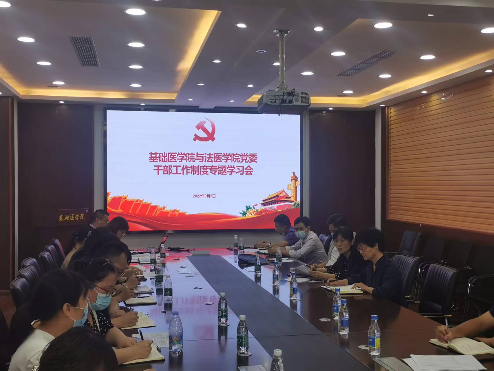 (文/耿少雷 图/岳学强)9月2日上午,基础医学院与法医学院党委在求是楼六楼基础医学院第一会议室举办干部工作制度专题学习会。基础医学院与法医学院党委书记王宏玲、副书记李照勇、白婕出席会议。党政办公室负责人及全体党支部书记参加会议。