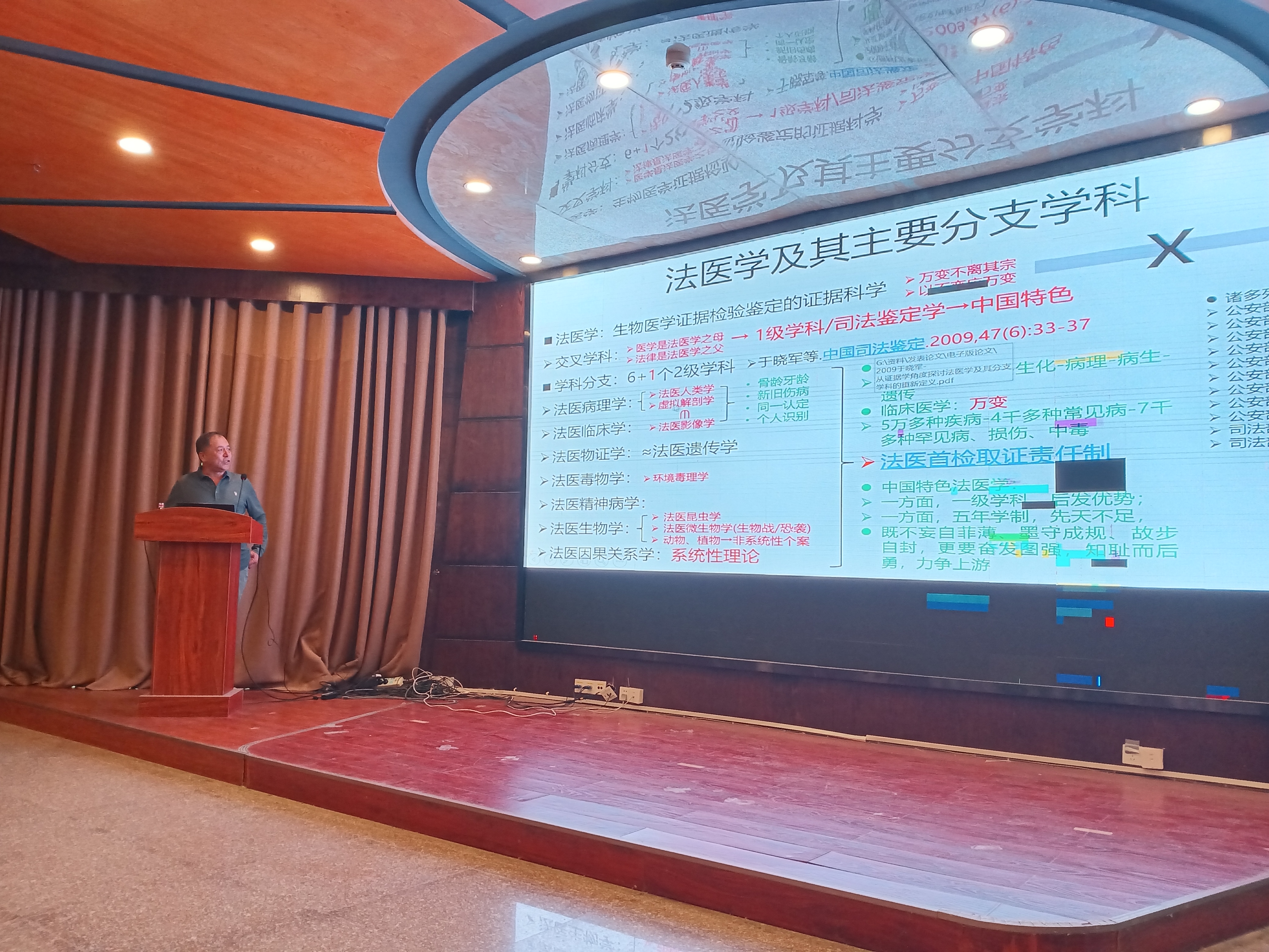 首先,汕头大学医学院于晓军教授做了题为“法医因果关系学的理论与实践”的报告。于晓军教授为汕头大学医学院法医学科带头人,博导、博士后合作教授,美国马里兰州法医局访问学者,先后从事法医学教学、科研及鉴定工作40余年。主持和参与国家自然科学基金课题、科技部国家科技支撑计划项目子课题等科研项目20余项,发表论文286篇,副主编、参编教材18部和专著6部。首开医学专业《法医学与整体医学》公共课,首倡中国特色法医学和临床医学《整合医学》/《整体医学》教改。于晓军教授结合法医鉴定中实际案例,讲解了构建符合法医鉴定实际需求的唯一性证据链和证据体的理论体系的必要性,强调法医鉴定中思维模式“四个关系”:空间关系,时间关系,本质关系和量化关系。通过将近2个小时的讲座,于教授为全院师生全面系统地阐述了“法医因果关系学”这一新的理论体系,极大地拓展了大家的思维和视野。