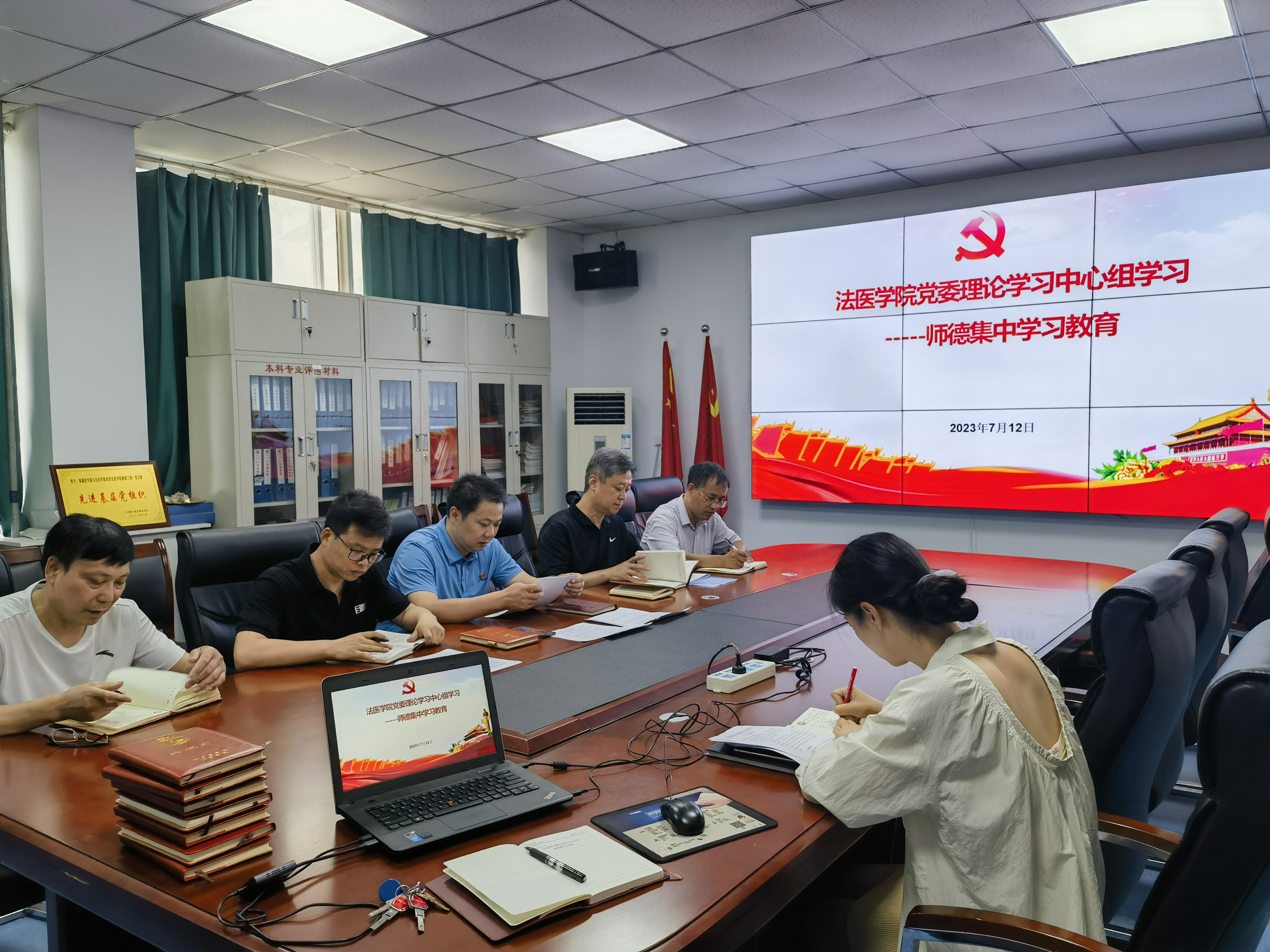 (文/图 涂飞)为深入学习习近平总书记关于教师队伍建设的重要指示批示精神,加强教师法治教育。7月12日上午,法医学院党委理论学习中心组在求真楼443会议室召开师德集中学习教育会。学院党委全体成员参加会议,会议由党委书记赵宝强主持。